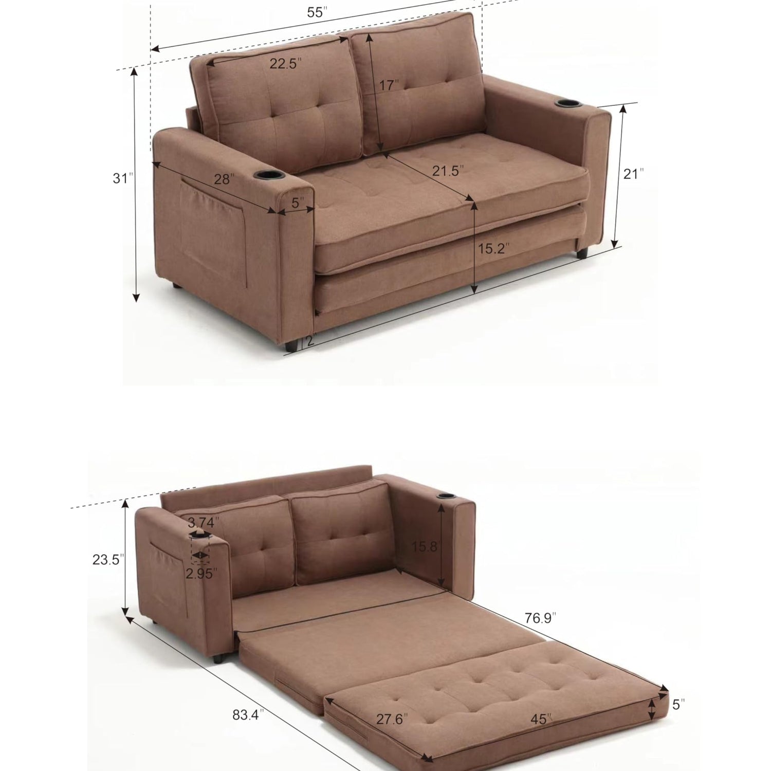 Merax Folding Sofa Bed with 2 Storage Pockets, Linen Convertible Couch Bed with Cup Holders, Loveseat Sleeper Sofa, Folding Couch Bed for Small Spaces for Living Room, Apartment, Brown