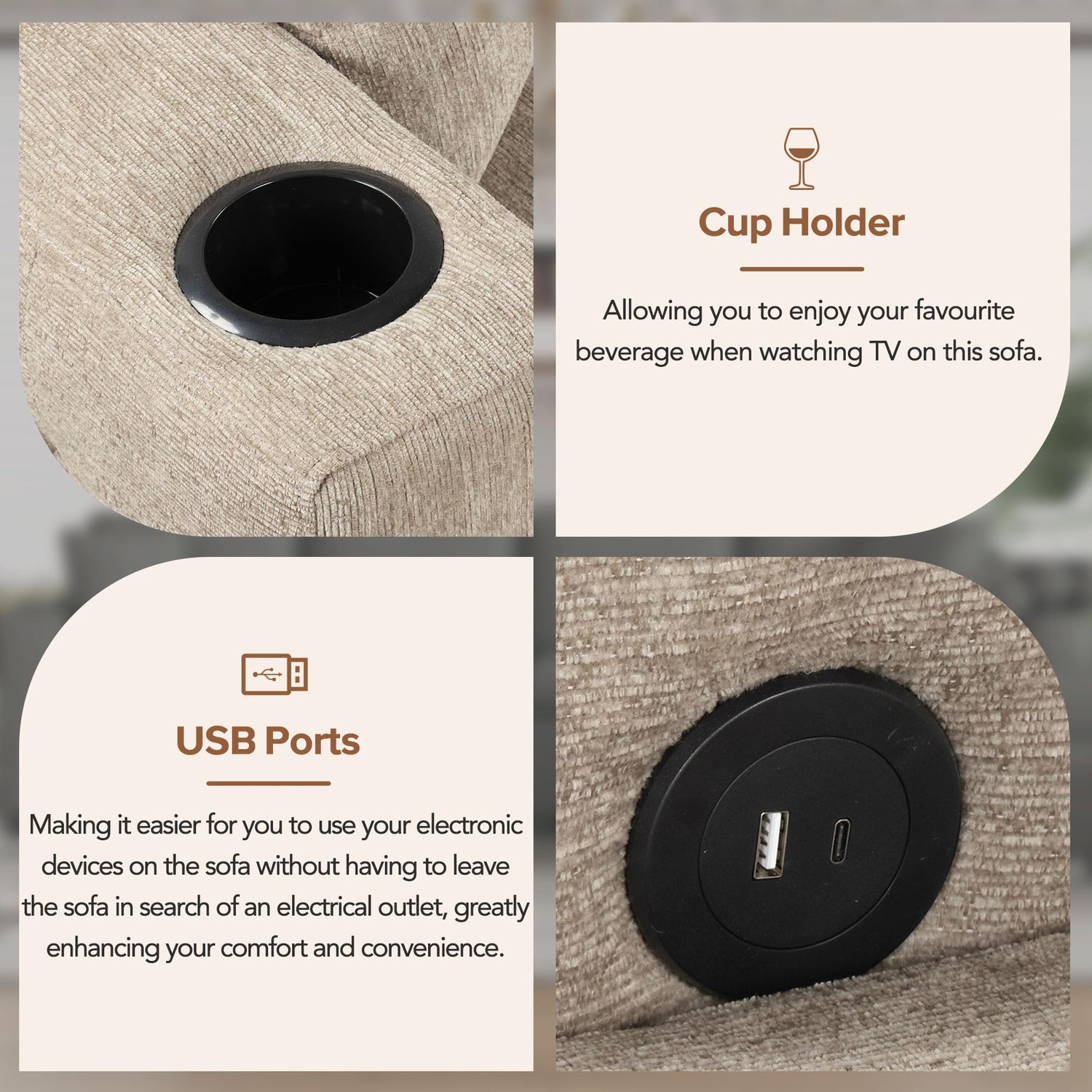 - Made for Convenience: Equipped with two built-in USB ports for charging devices and a convenient cup holder, this sofa combines comfort with modern convenience for a more cozy lounging experience.