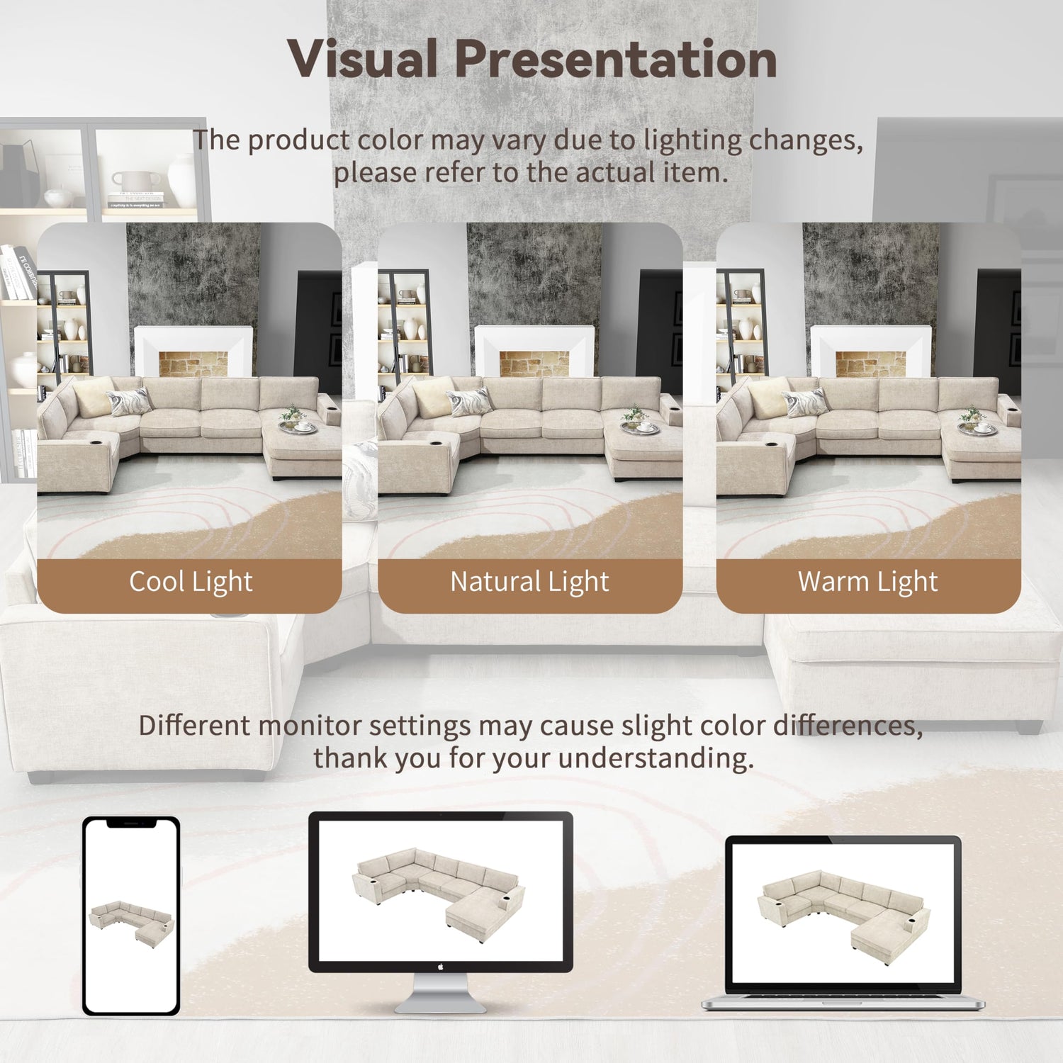 Merax Modern Oversized U-Shaped Sectional Sofa with Cup Holders & Chaise Lounge, Chenille 6-Seat Couch Set Sleeper Bed with Deep Seat Beige