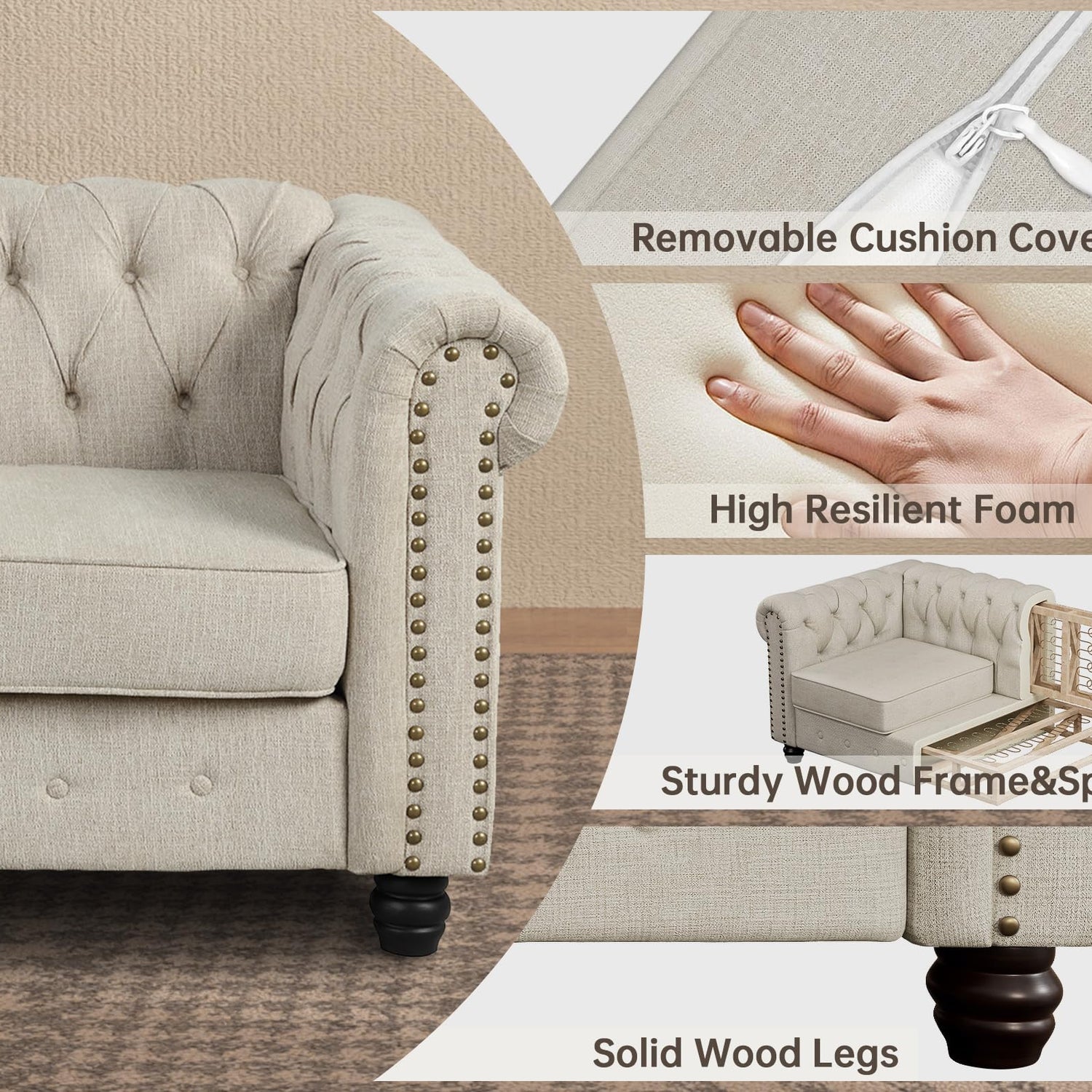 - Sturdy and Durable Construction: Built with a solid wood frame and torus-shaped wooden legs, the Morden Fort Chesterfield Loveseat is designed for durability and stability. The robust armrests and backrest offer excellent support, reflecting our commitment to quality craftsmanship.
