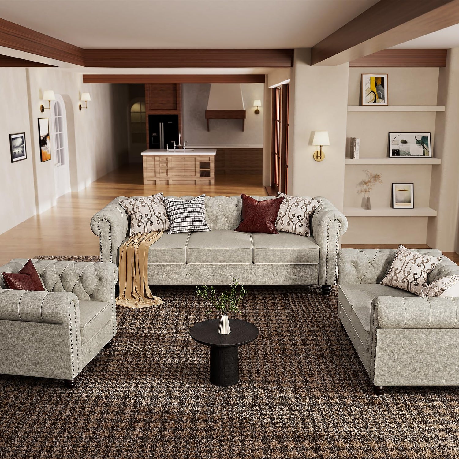 - Timeless Chesterfield Design: The Morden Fort Chesterfield Loveseat Sofa set features classic tufted buttons and brass nailhead trim, exuding a sense of noble elegance. This loveseat sofa combines traditional charm with modern practicality, making it a standout piece in any living room.