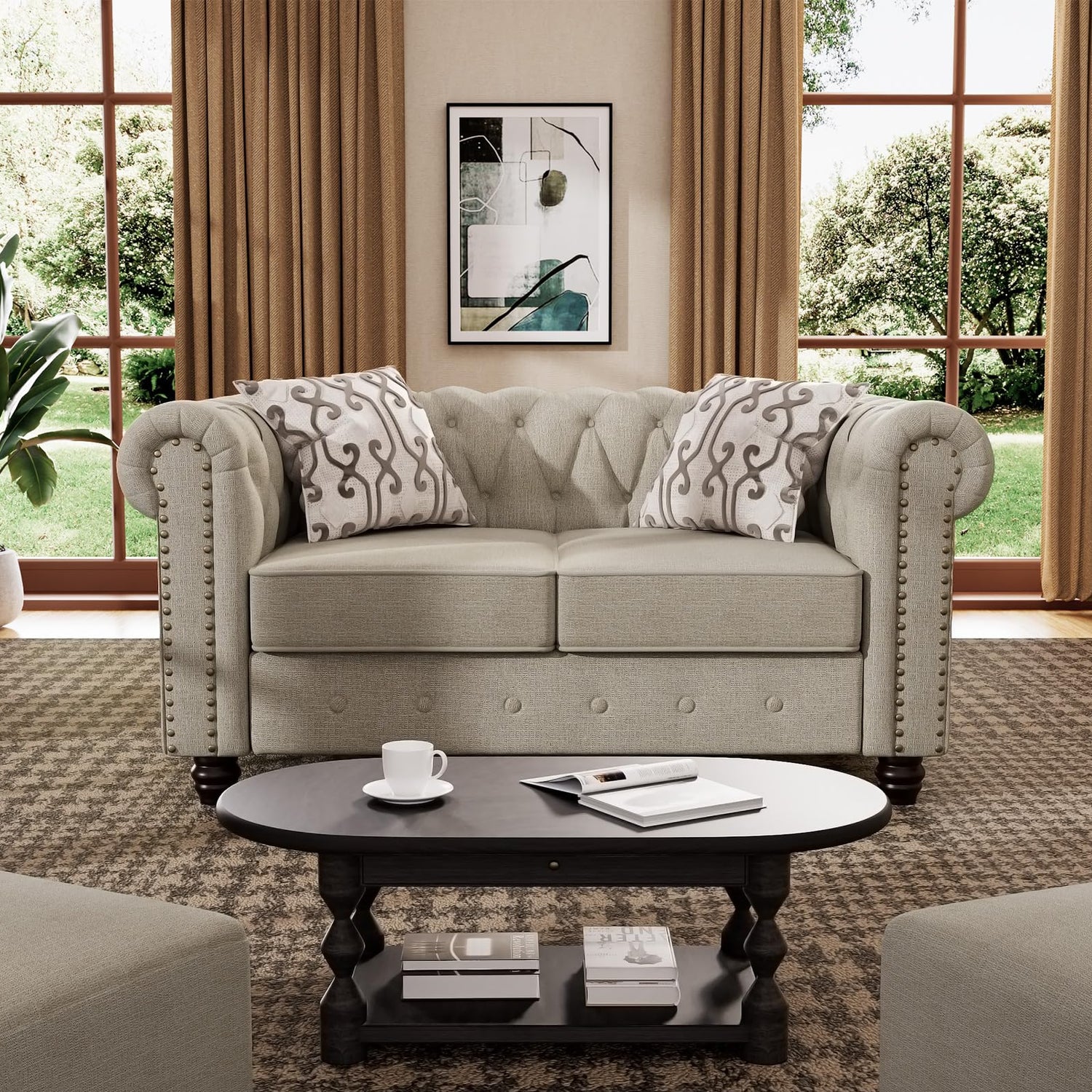 Morden Fort Classic Chesterfield Loveseat Set 60'', Tufted Loveseat Sofa Set with Solid Wood Legs Thick Cushion, Pet-Friendly 2-Seater Sofa Couch for Living Room Bedroom Apartment - Linen Beige