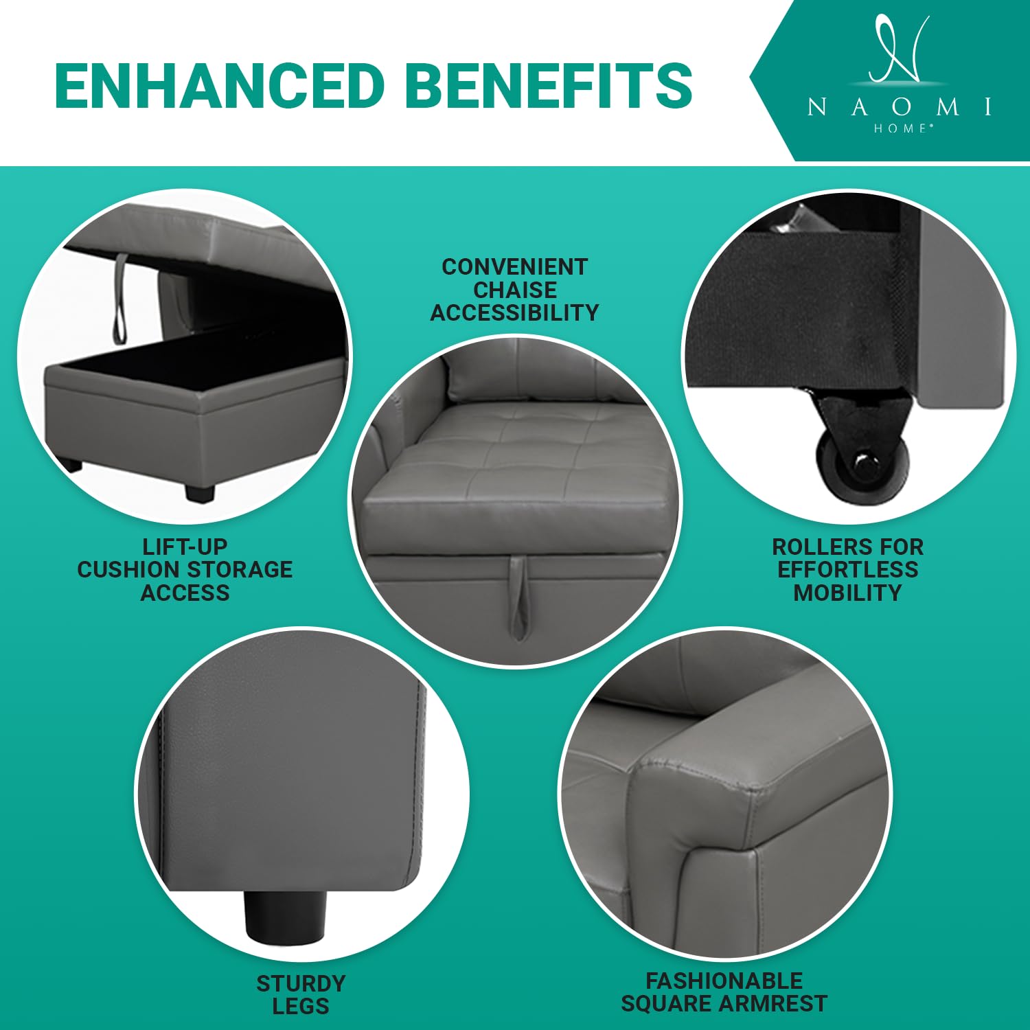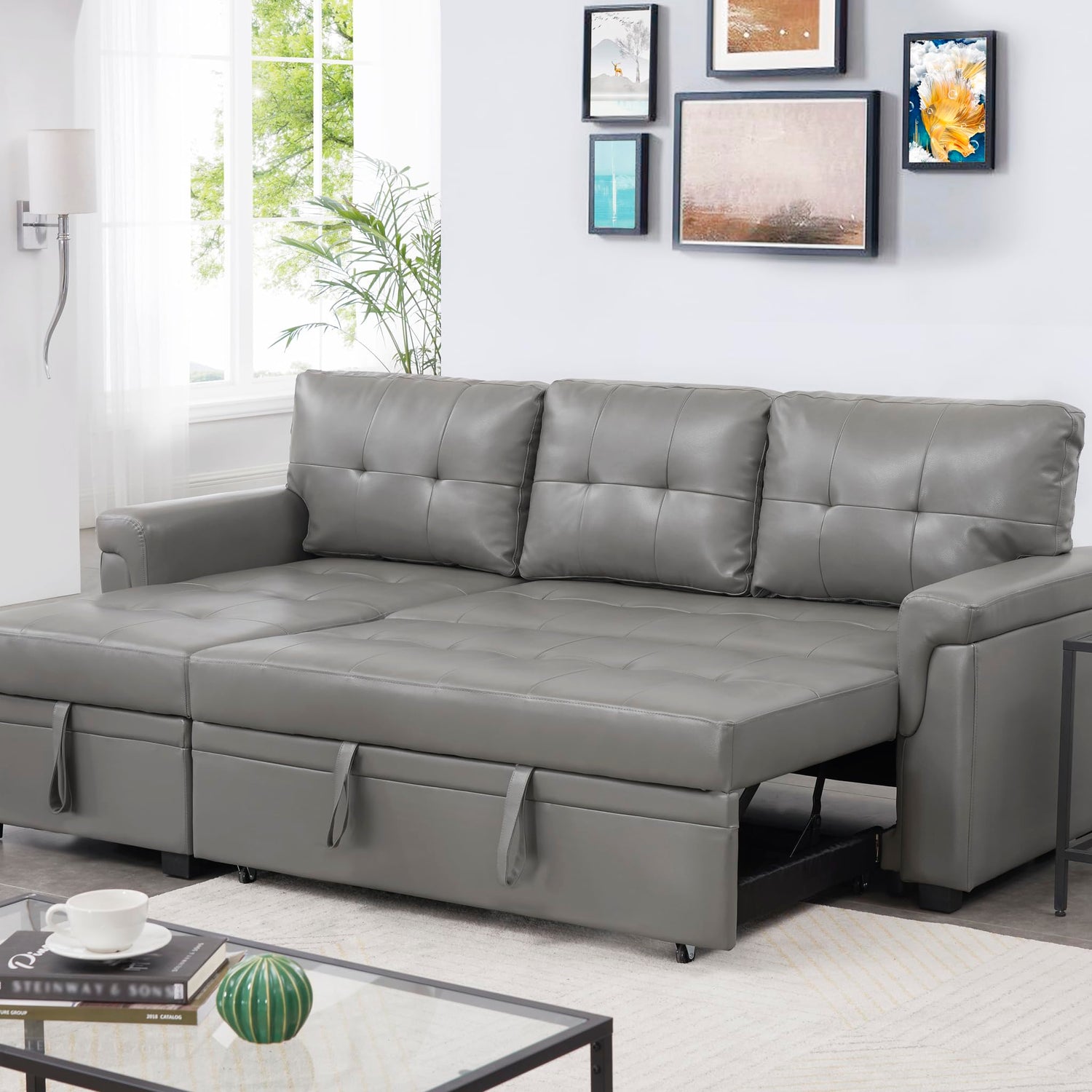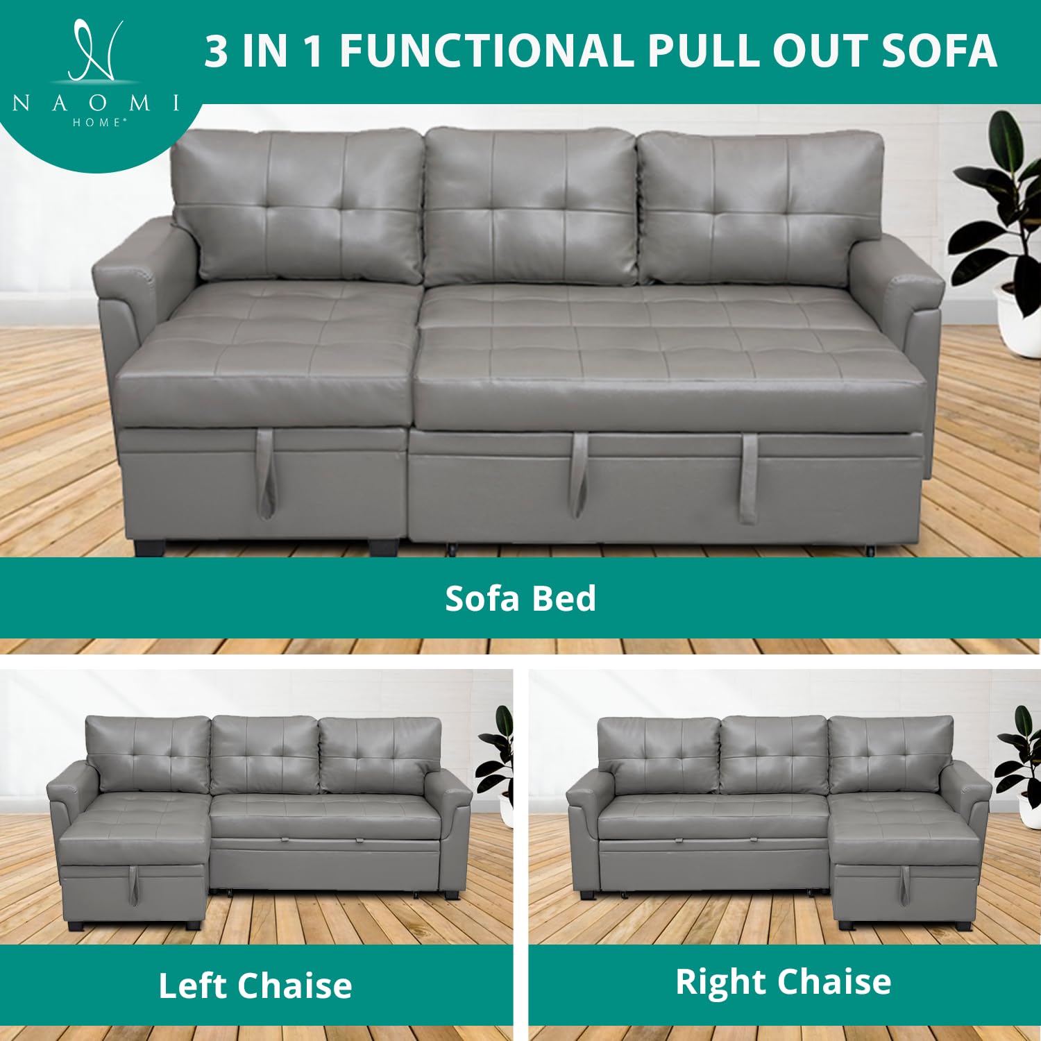 Naomi Home Jenny Sectional Sofa Sleeper with Storage Chaise, Tufted Pull Out Couch with Storage, Sectional Bed, L-Shaped Reversible Sleeper Sofa, Gray,Air Leather