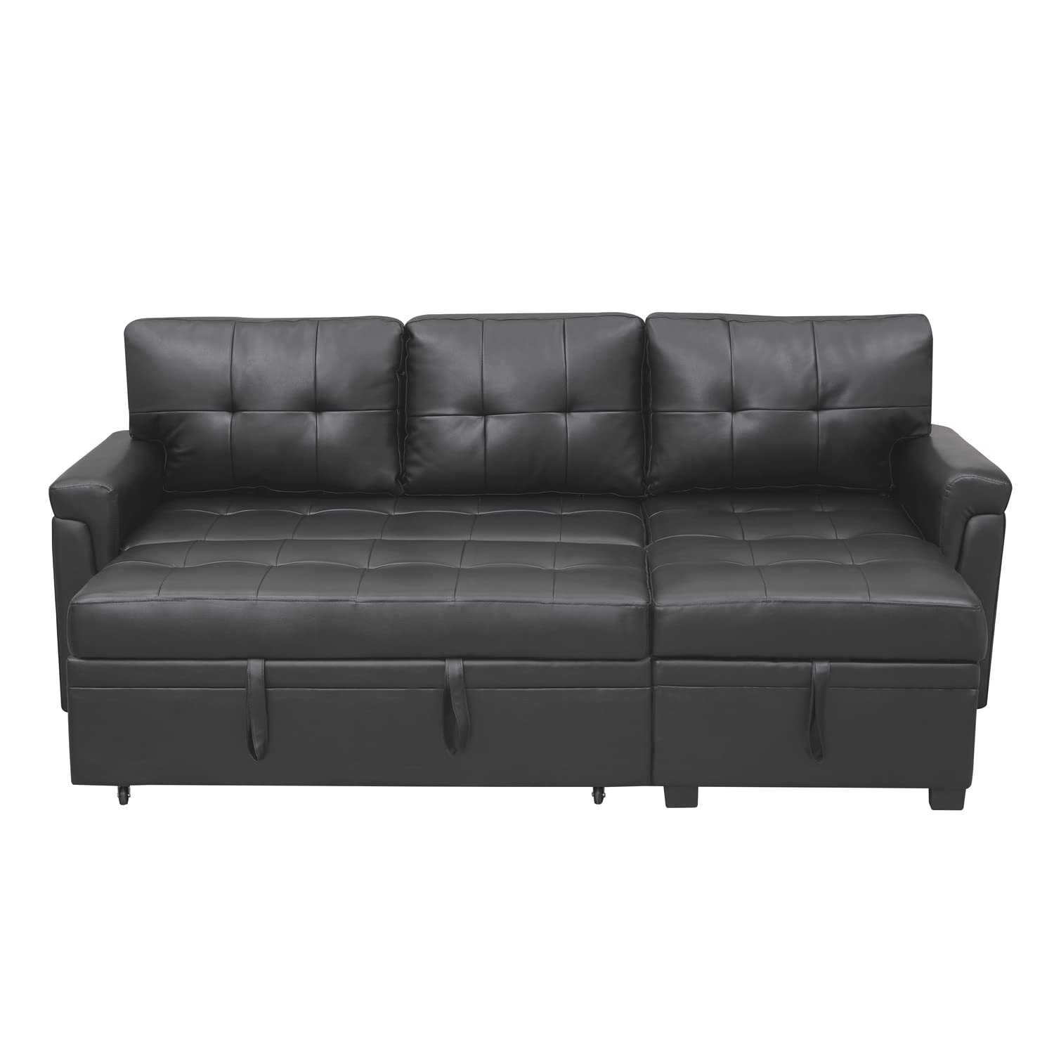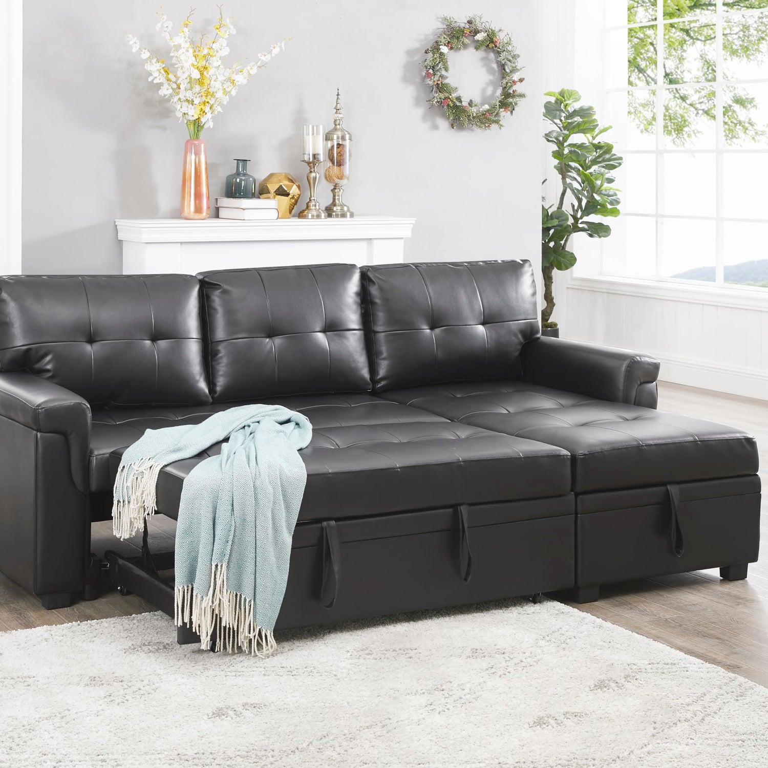 Naomi Home Jenny Sectional Sofa Sleeper with Storage Chaise, Tufted Pull Out Couch with Storage, Sectional Sofa Bed, L-Shaped Reversible Sleeper Sofa with Storage, Black,Air Leather