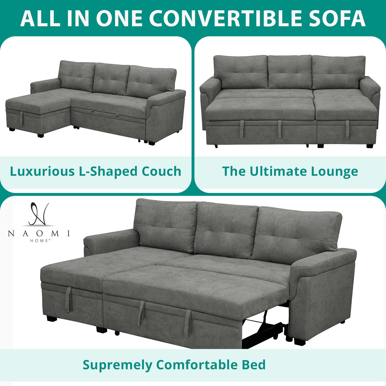 • ASSEMBLY MADE A BREEZE: No more worries: Our sofa bed is engineered for easy setup. Follow our clear instructions, and you'll be enjoying your dream l shape couch in no time. This couch with storage is designed for convenience.