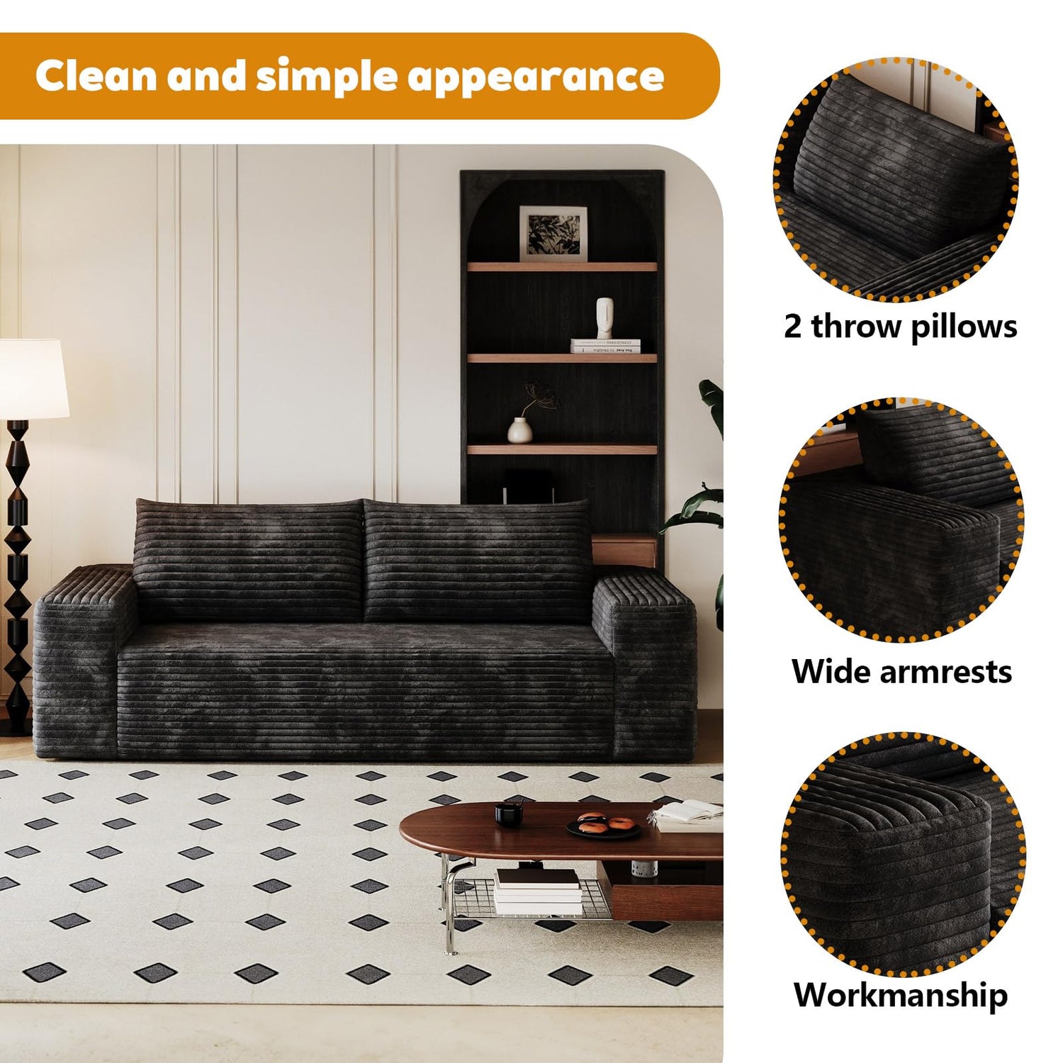Ningering 63" Sofa in a Box Compressed, Boneless Couch with Wide Armrests & 2 Cushions, Cloud loveseat Sofa for Living Room, Memory Foam, Deep Seat, Corduroy Fabric, No Assembly (Black, 2)