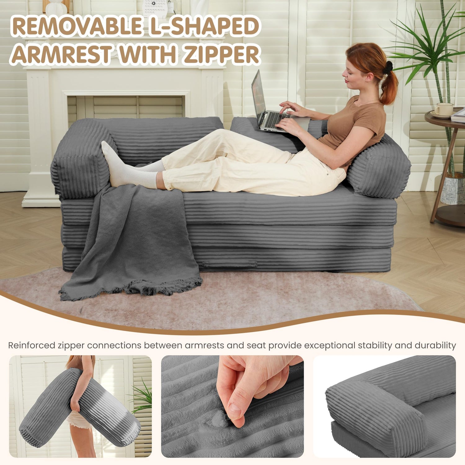 - MULTIFUNCTIONAL DESIGN - Experience ultimate versatility with this 5-in-1 convertible sofa bed! Simply adjust the removable L-shaped armrests to transform it from a comfortable boneless couch into a spacious sleeper sofa or a queen size mattress. It's the perfect guest bed, space-saving apartment sofa, and cozy entertainment center for movie nights—a must-have for small spaces, living rooms, and dorm rooms!