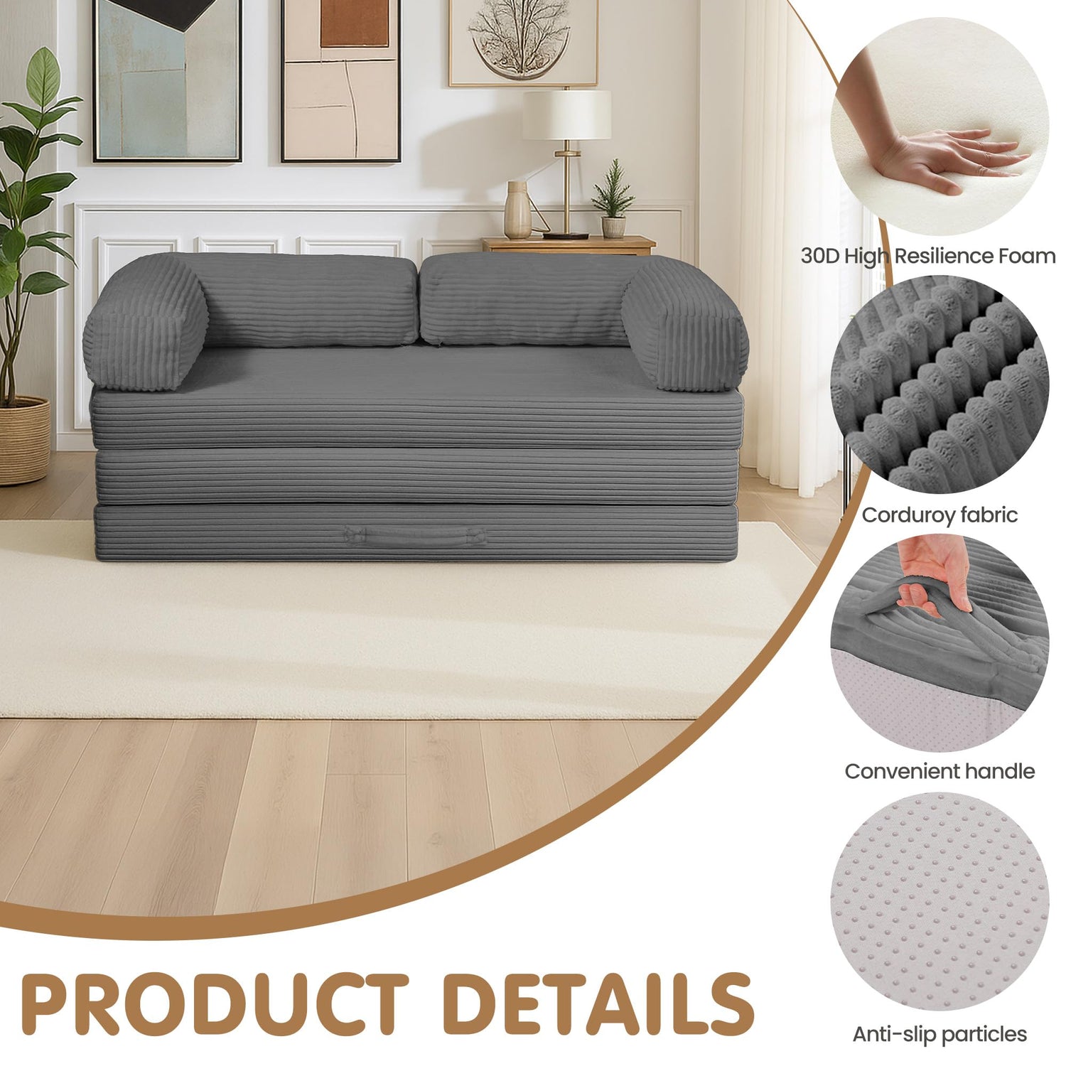- ERGONOMIC COMFORT DESIGN - This folding sofa bed features cloud-like cushions with 30D high-resilience memory foam for superior support and elasticity. The zippered, removable L-Shaped Armrests and machine-washable cover offer effortless cleaning, while the hidden handle and non-slip base ensure easy transformation and stability. Its practical tri-fold design maximizes space in studio apartments and tiny homes.