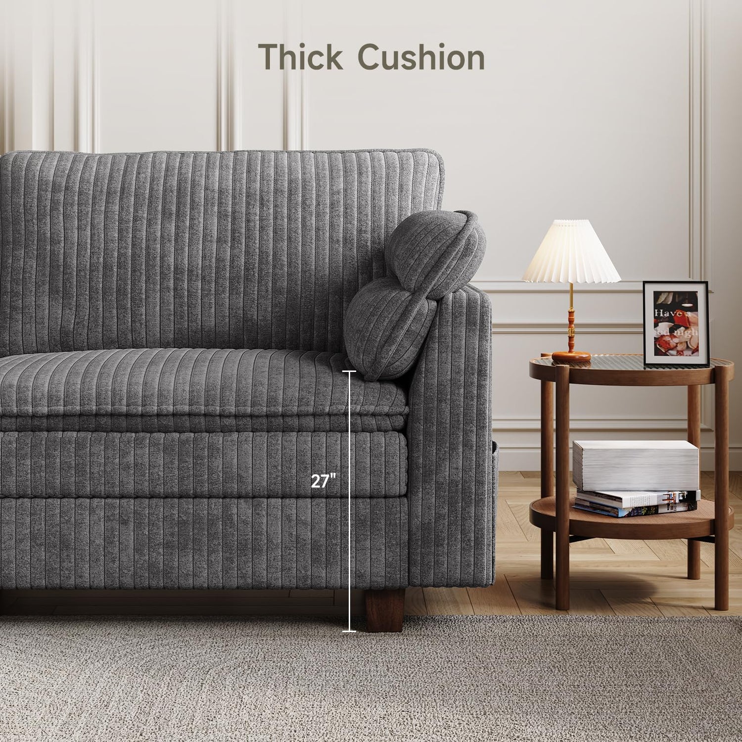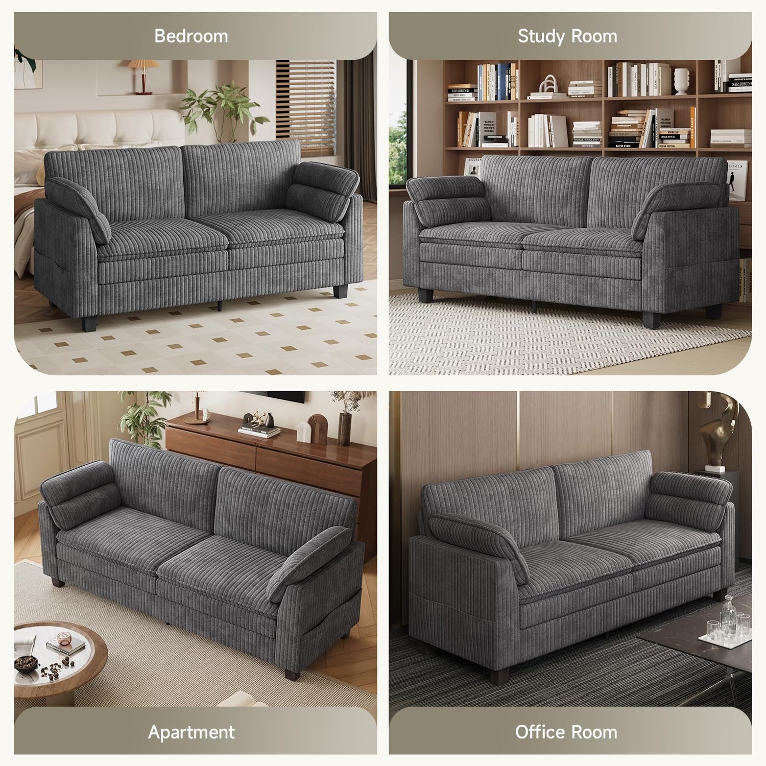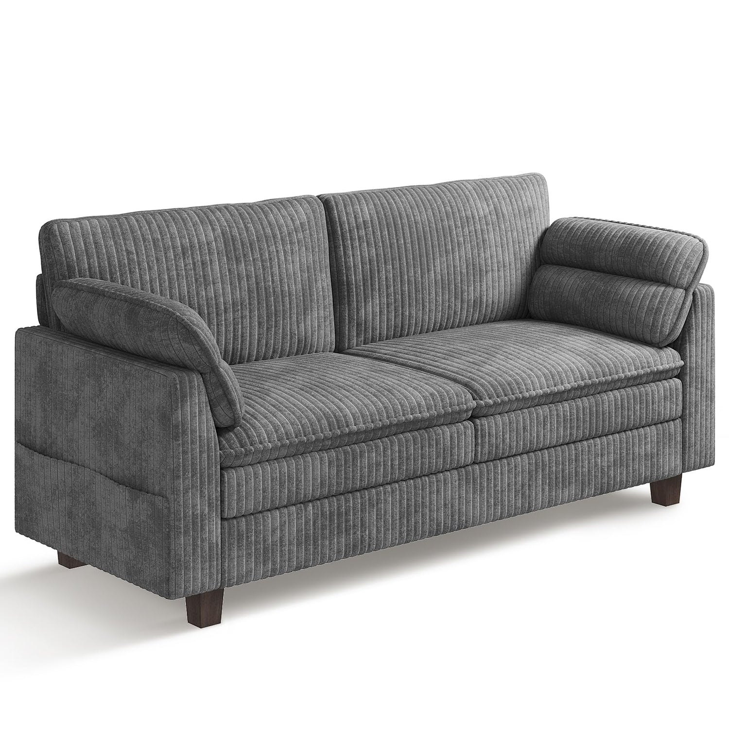- BREATHABLE CORDUROY FABRIC: This couch features a clean, minimalist silhouette made from soft corduroy fabric, effortlessly blending with a variety of interior styles.Pillow-shaped armrests with side storage pockets serve a dual purpose, offering support for your upper body while reducing fatigue during prolonged sitting.When lying down, these armrests can act as pillows, providing comfortable support for your head.