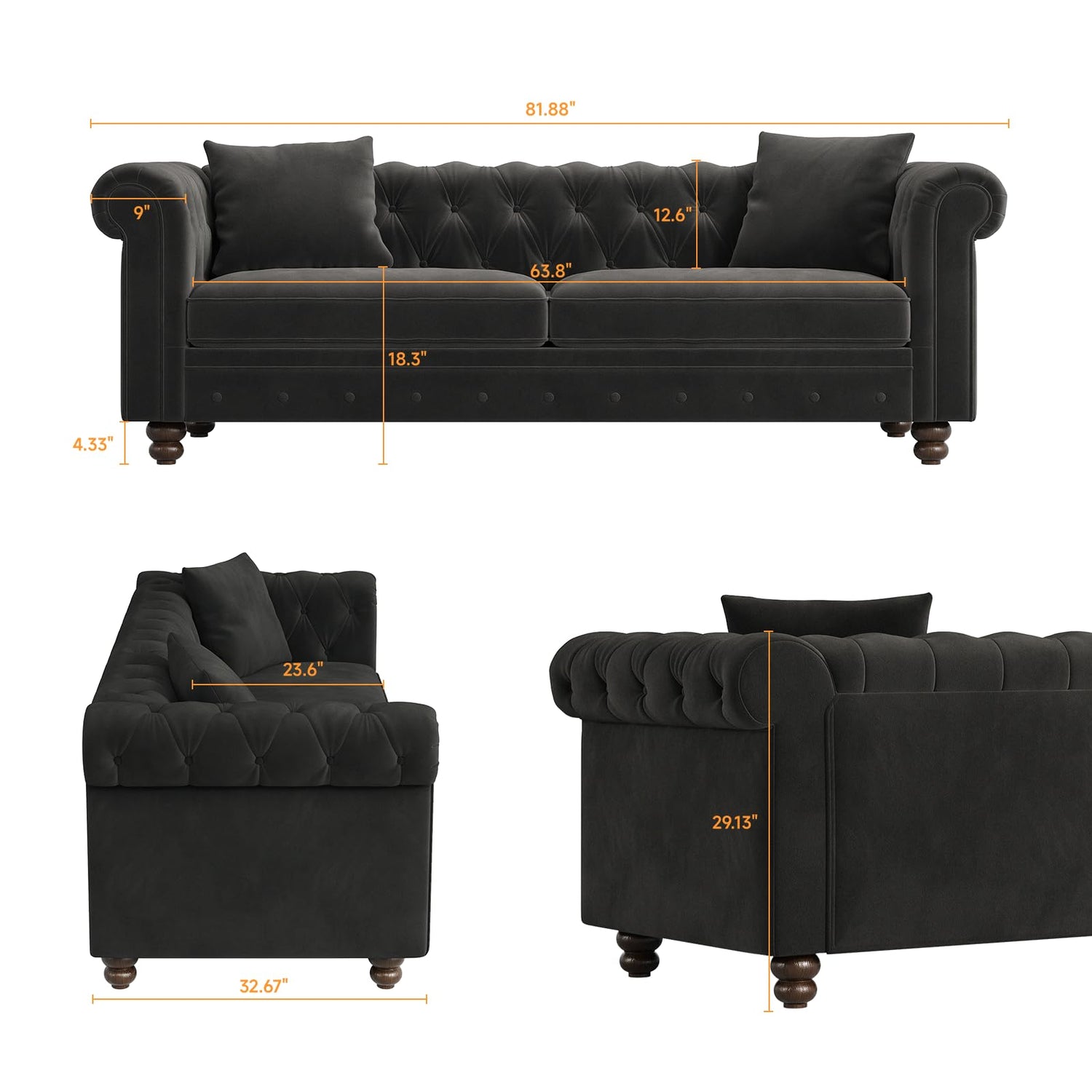 ONBRILL 82" Chesterfield Sofa, Black Velvet Couch with Rolled Arms, 23.6" Deep Seat Couch w/2 Throw Pillows, Button Tufted Backrest, Turned Wood Legs, Comfy Loveseat Sofa for Living Room, Bedroom