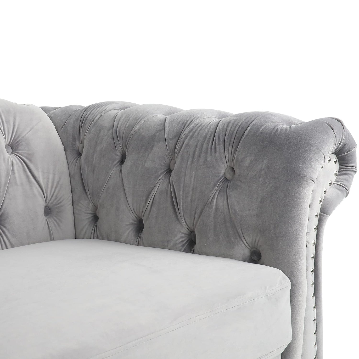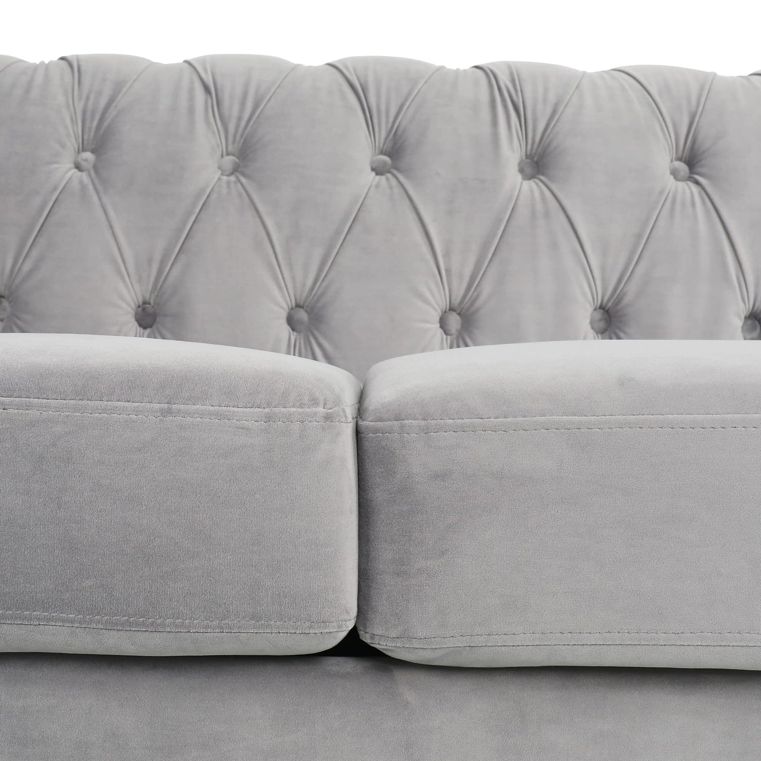 Details: Velvet Chesterfield SofaCombine FreelyThe sectional sofa has an exquisite and fashionable appearance. Combine freely according to your needs to perfectly decorate your space. It is the best partner for your apartment,living room, bedroom and hall.Comfortable Sofa CouchThick, comfortable seat, made of high quality soft,built-in high density sponge, pressure evenly dispersed, engineering design, giving you maximum comfortable feeling.SpecificationProduct Size: 84.5" * 32" * 27"(L * W * H)Color: Gray, Green, BlueApplicable object: Family living roomMaterial Fabric: Short-haired Dutch velvetLeg Material: Solid Wood FeetCushion: Spring foam cushion