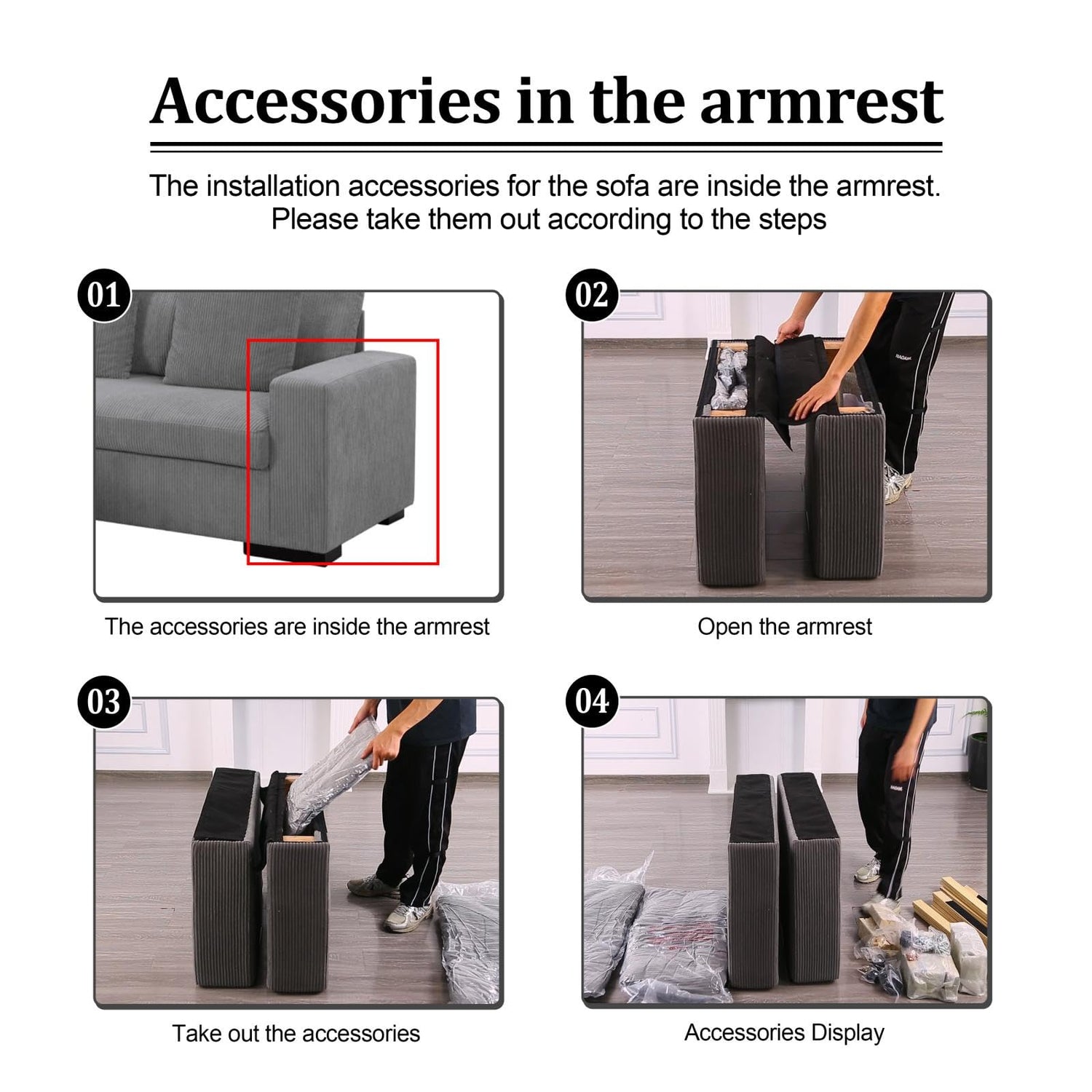 - Easy Assembly: The sofa comes in only one box with detailed instructions and tools. Pro Tip: Allow cushions 48hrs to expand fully. Natural lighting may cause slight color variations. Notice: The sofa part B C E and other accessories are inside armrest part L & R. After you open the armrests, please take them out. Please be free to contact us if you have any questions