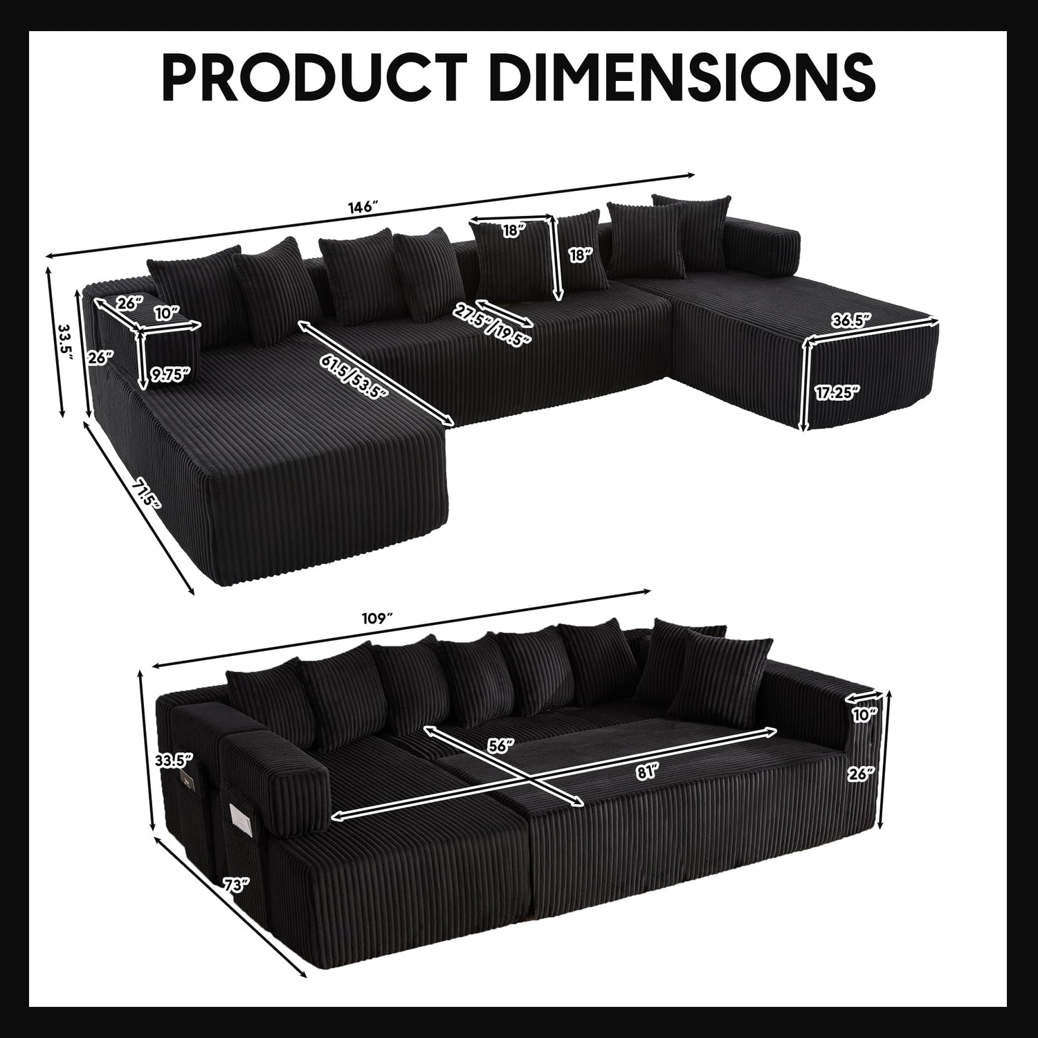 Oversized Cloud Boneless Couch with Chaise, Modern Modular Sofa with Deep Seat, Various Combinations Upholstered Couches with Storage, No Assembly Required-Black