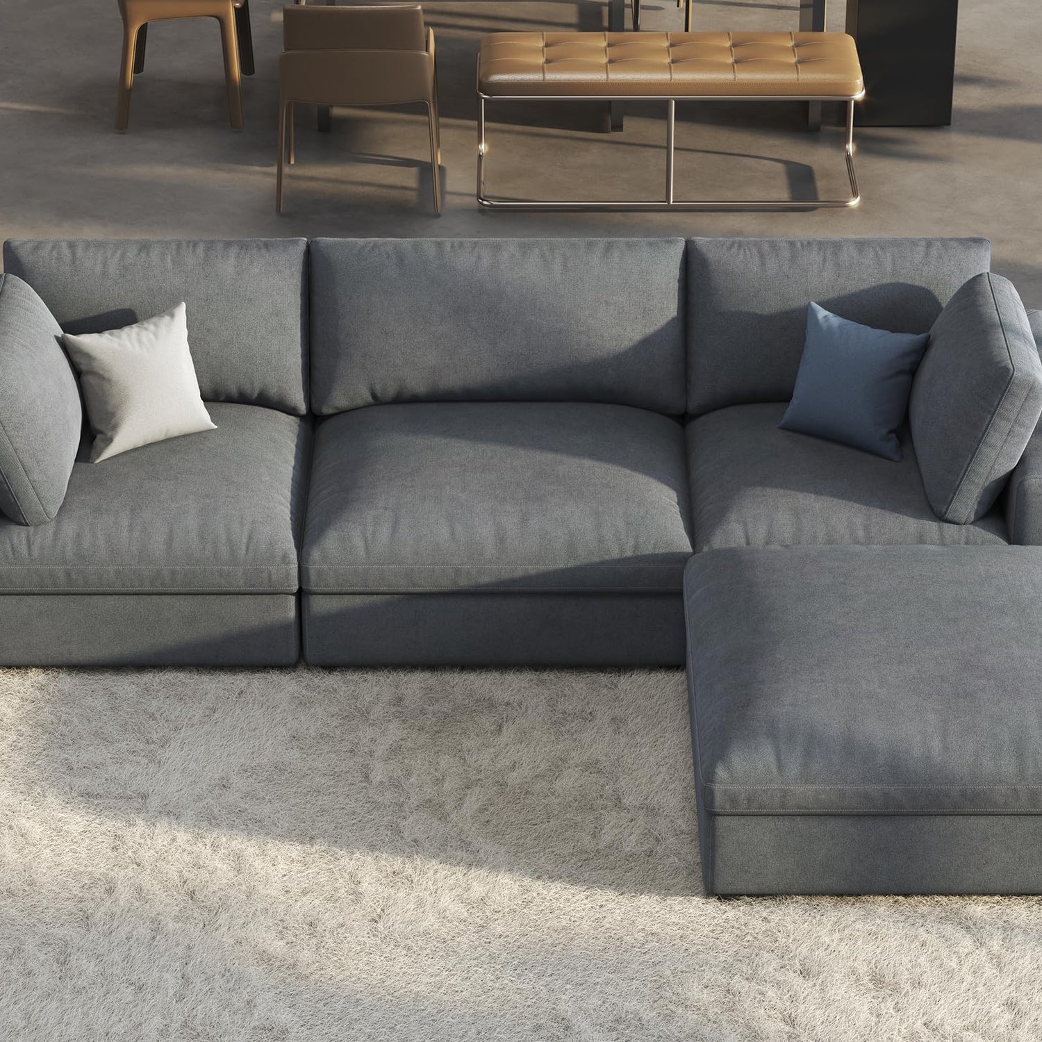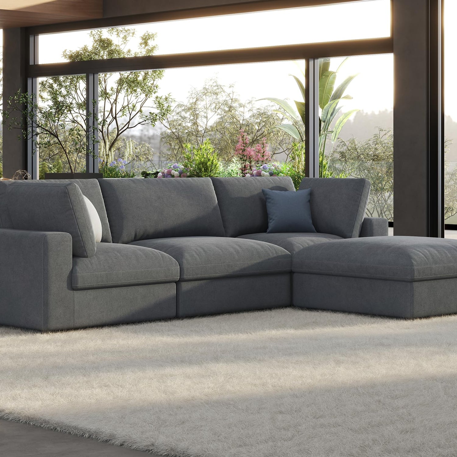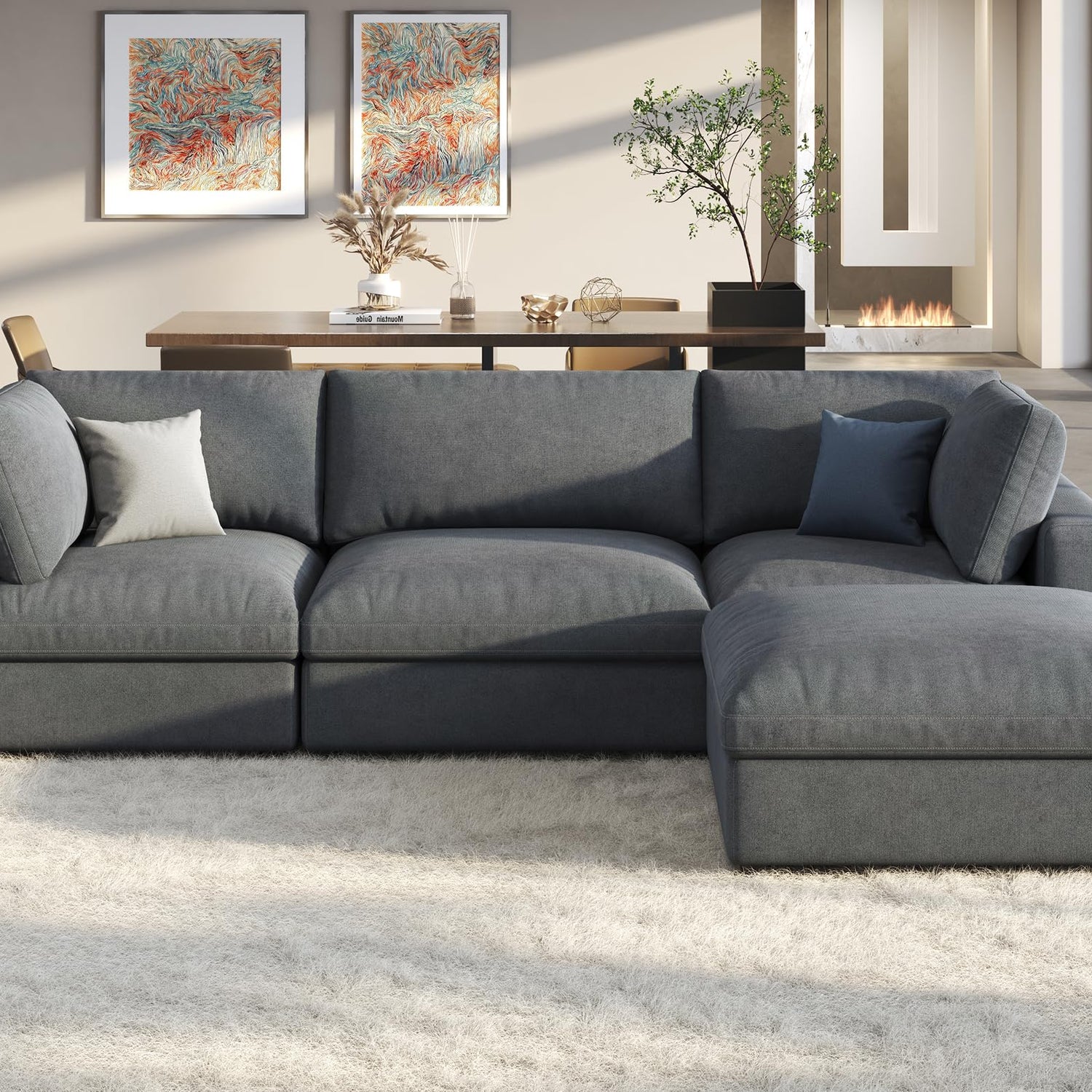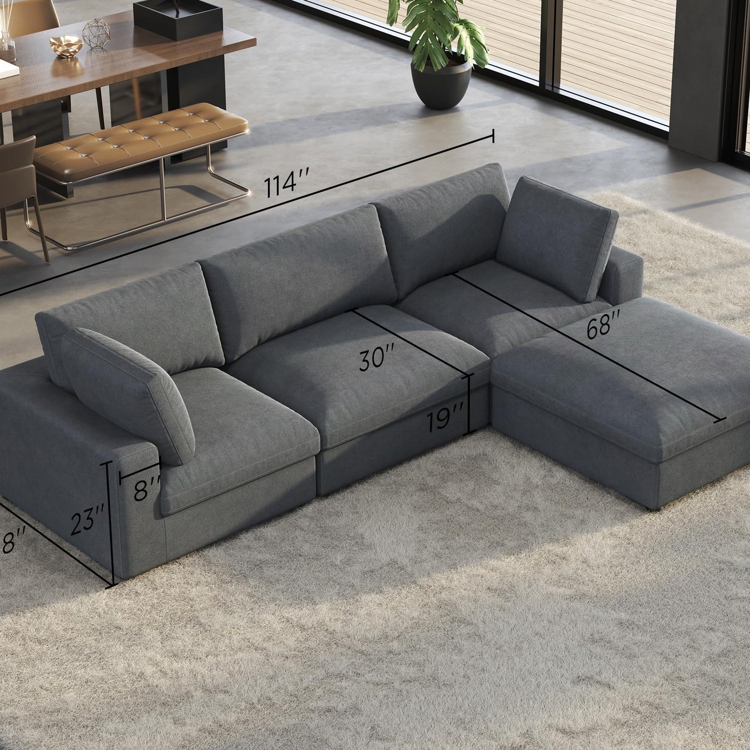 PaPaJet Modular Sectional Sofa, 114 Inches Oversized Down Filled Sectional Sofa, 4 Seats L Shaped Cloud Couch with Chaise, Ottoman, Comfy Sofa for Living Room, Grey Linen Couch Set