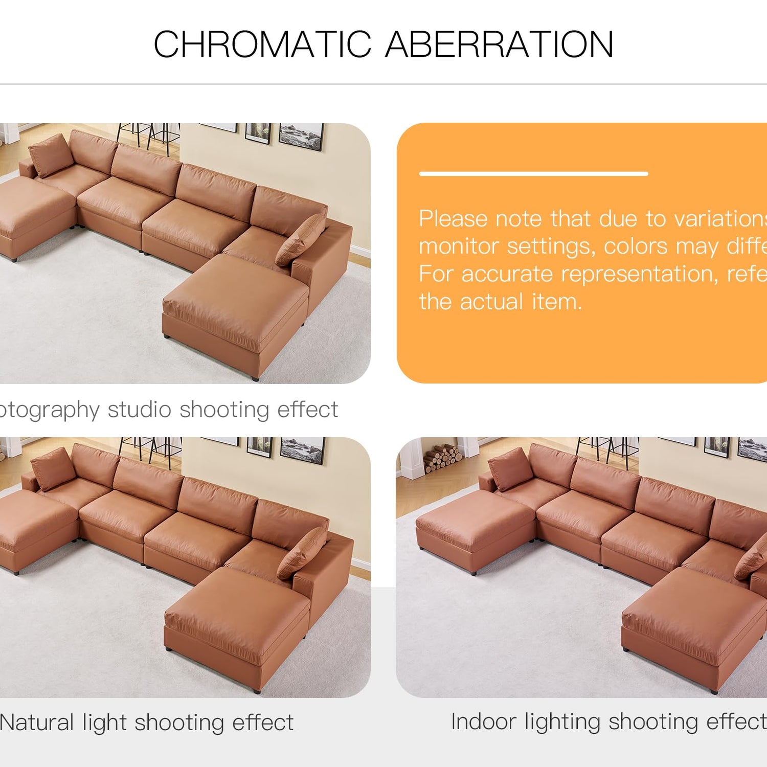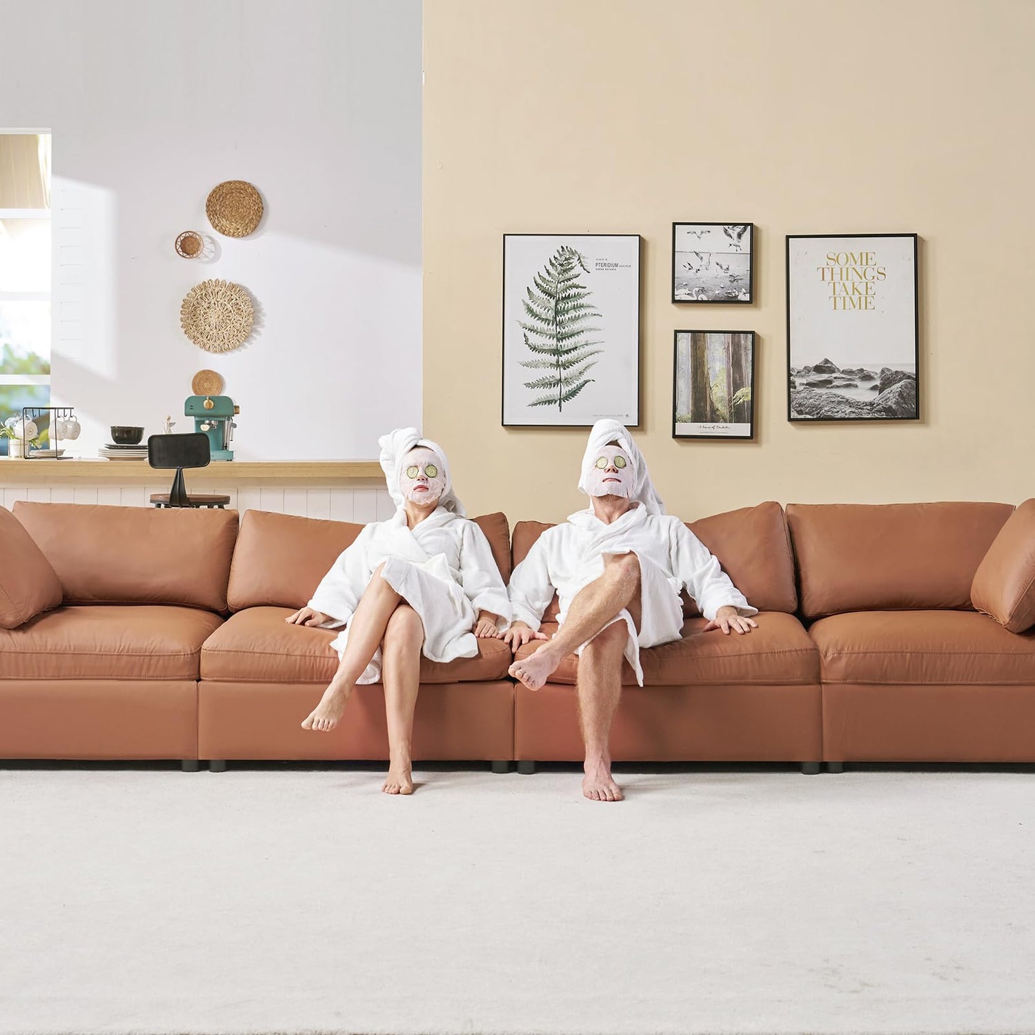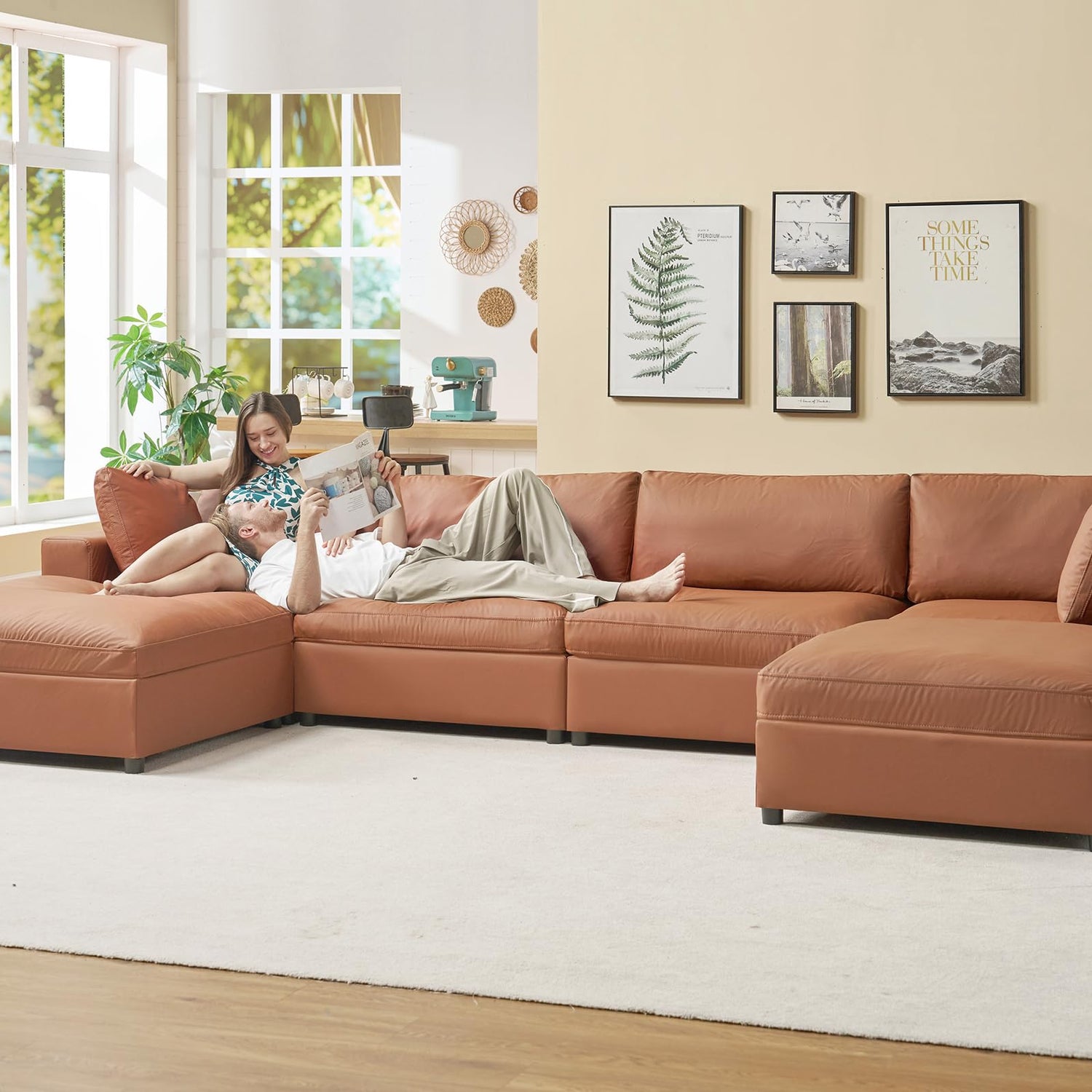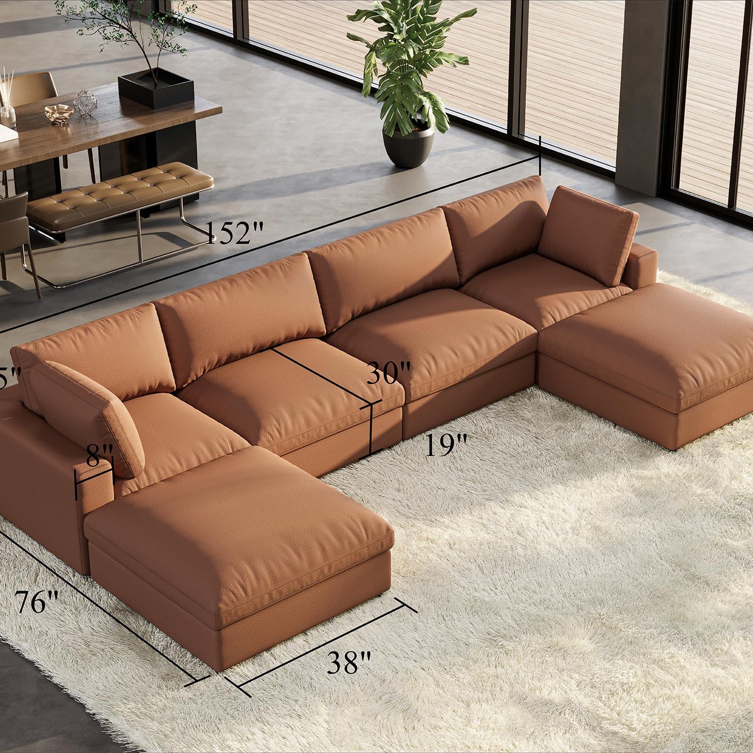 PaPaJet Modular Sectional Sofa, 152 Inches Down Filled Sectional Sofa, 6 Seats U Shaped Cloud Couch with Chaise, Ottoman, Oversized Couch for Living Room, Brown Anti-Scratch Leathaire Couch Set