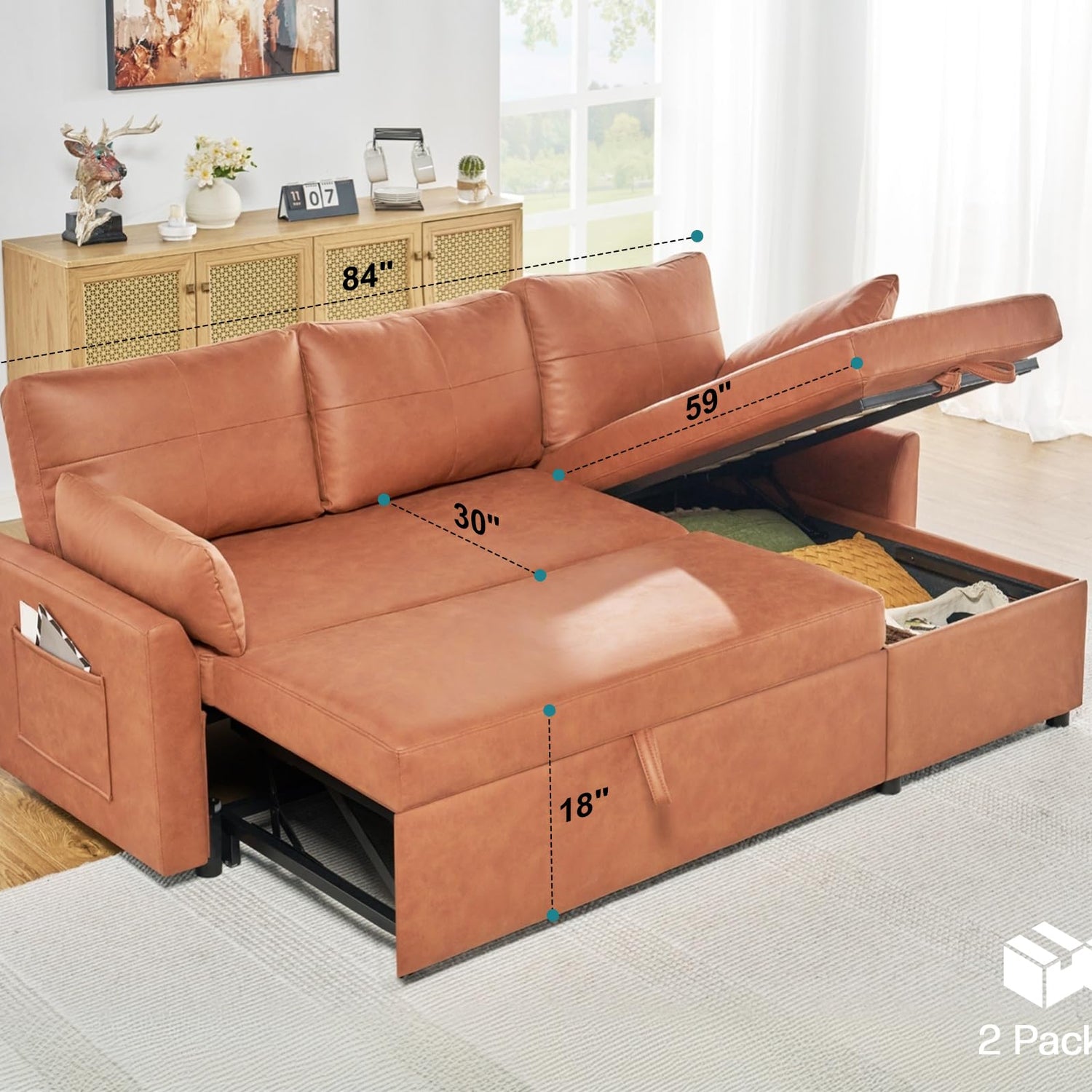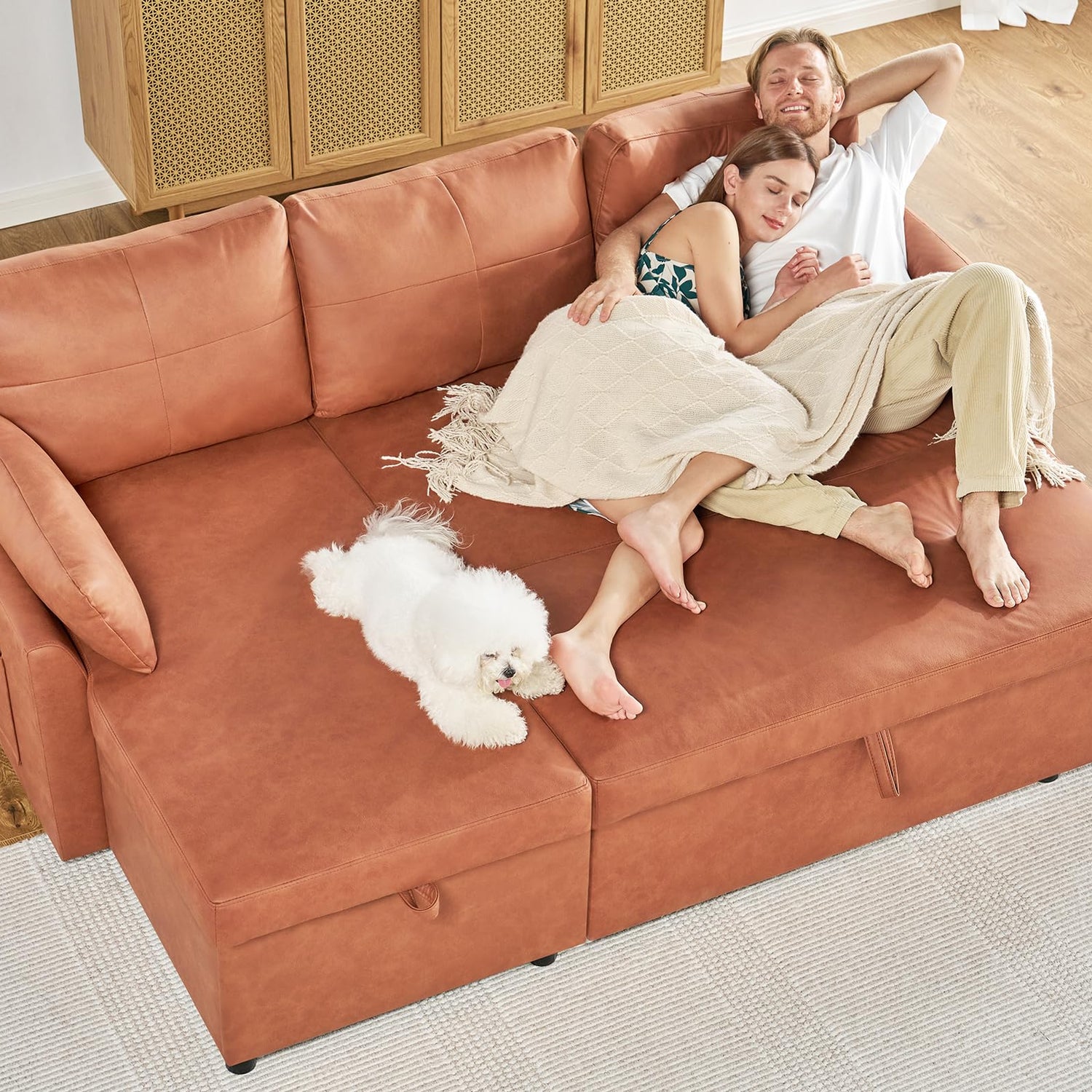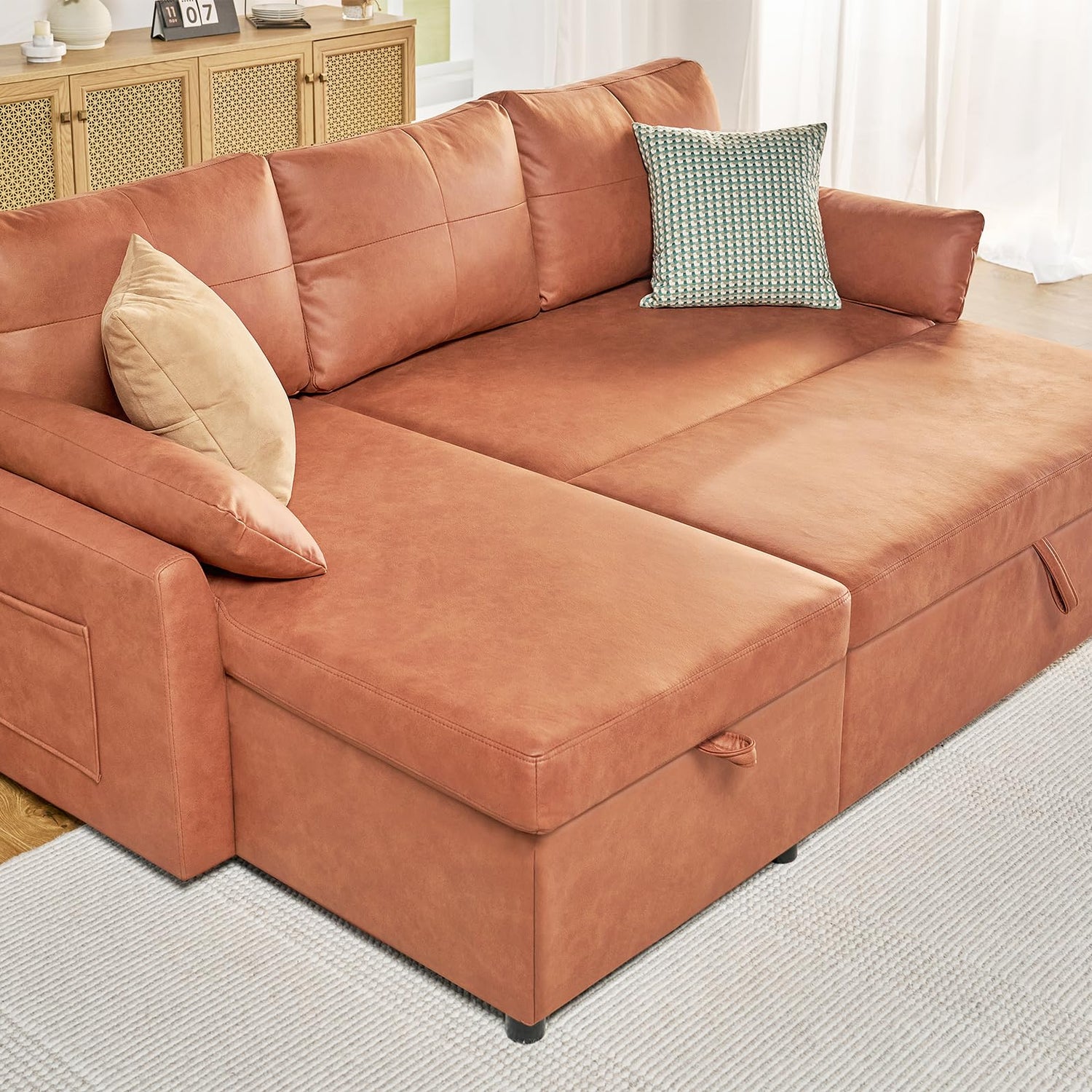 PaPaJet Sofa Bed, Sofa Sleeper with Storage Chaise, L Shape Pull Out Couch Bed, Oversized Sofas for Living Room-Brown Leathaire