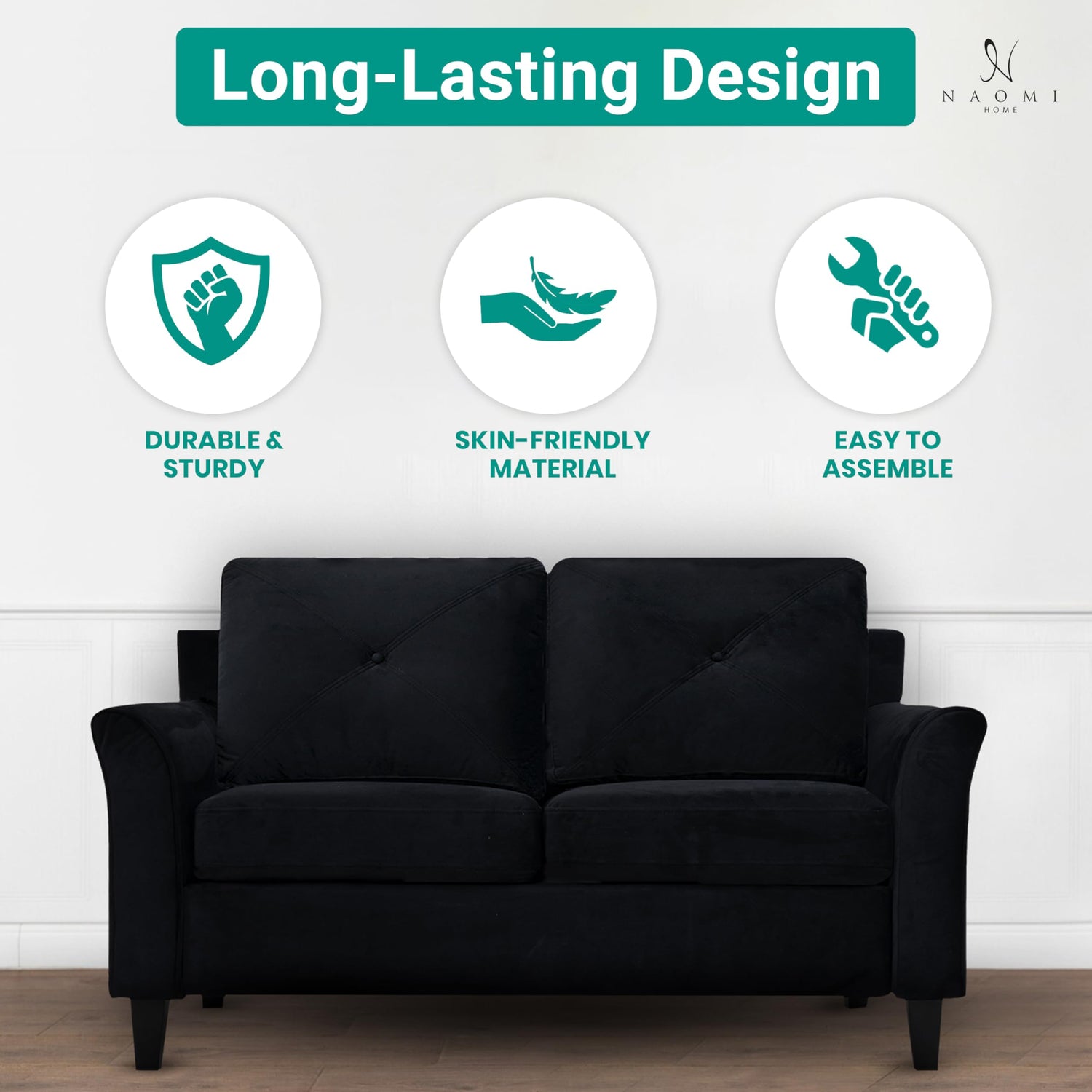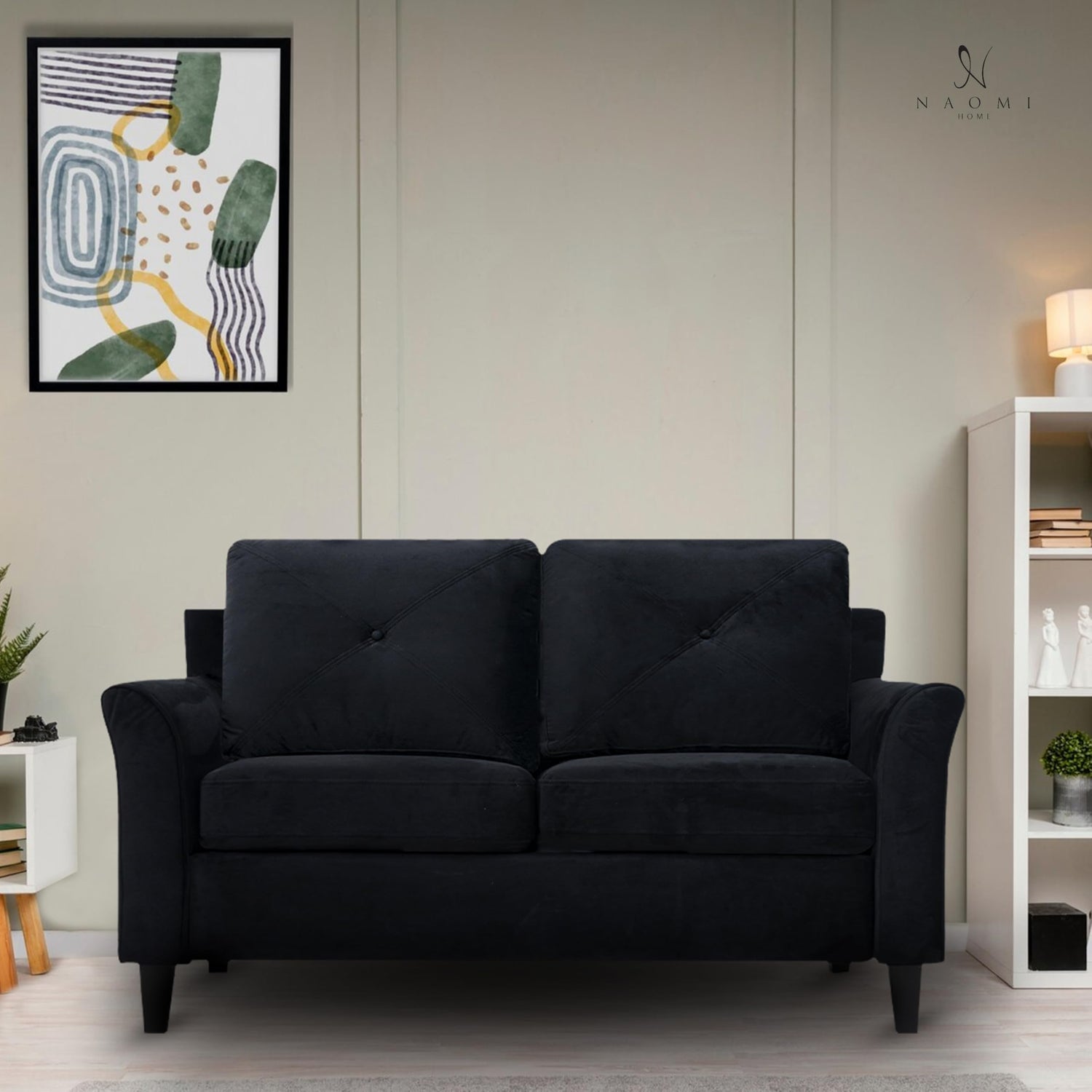 - CONTEMPORARY DESIGN: Indulge in ultimate relaxation with the Raelynn Button Tufted Microfiber Black Loveseat Sofa, a Black modern couch that's perfect for your living room. Deep button tufts and padded flared arms create a sophisticated and comfortable seating experience.