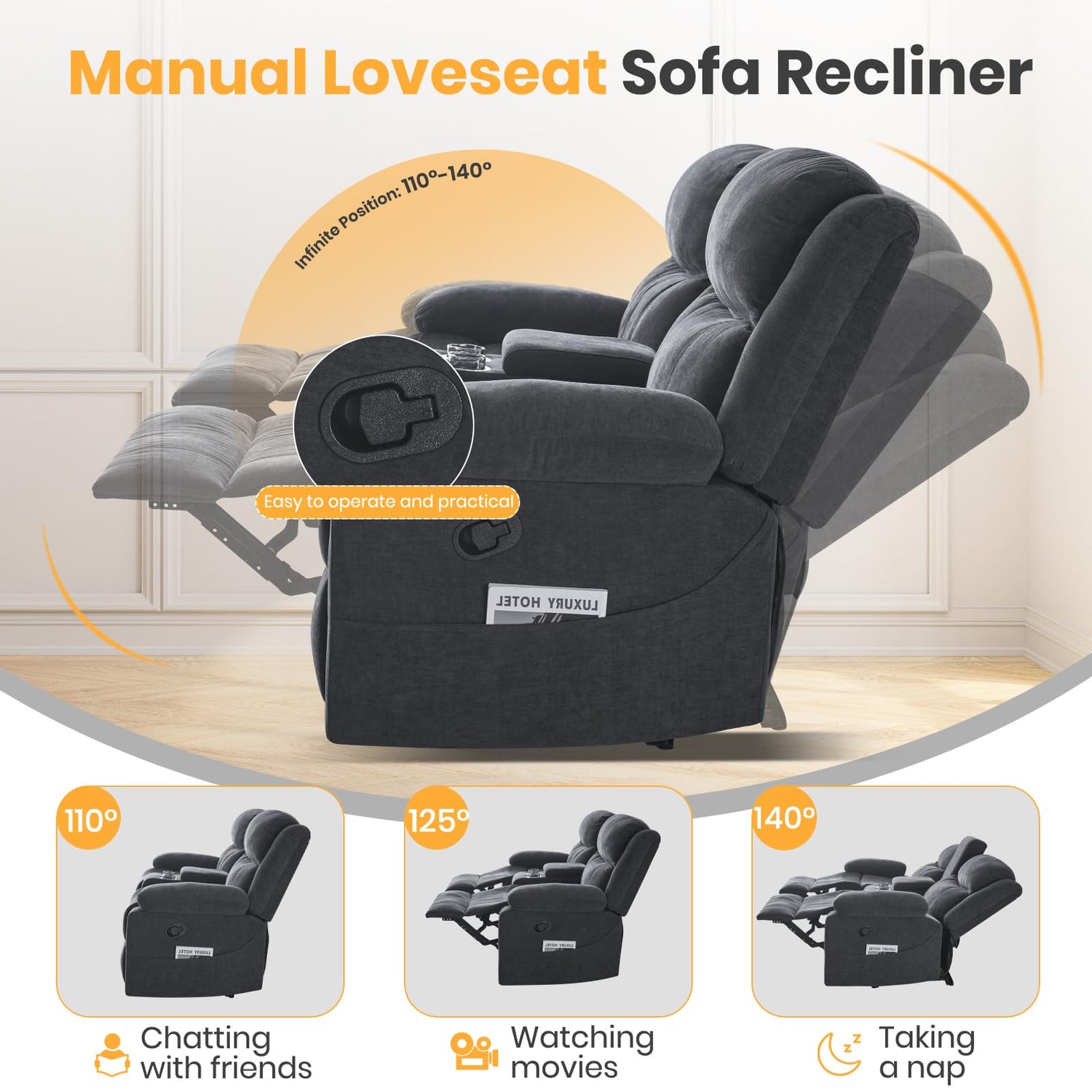 - Independent Operation: This loveseat recliner features dual independent control mechanisms and a split backrest design. Pull the buttons on both sides of the love seat and the footrest pops out automatically. The backrest can be tilted from 110 to 140 degrees, and the footrest can be adjusted from 0 to 90 degrees