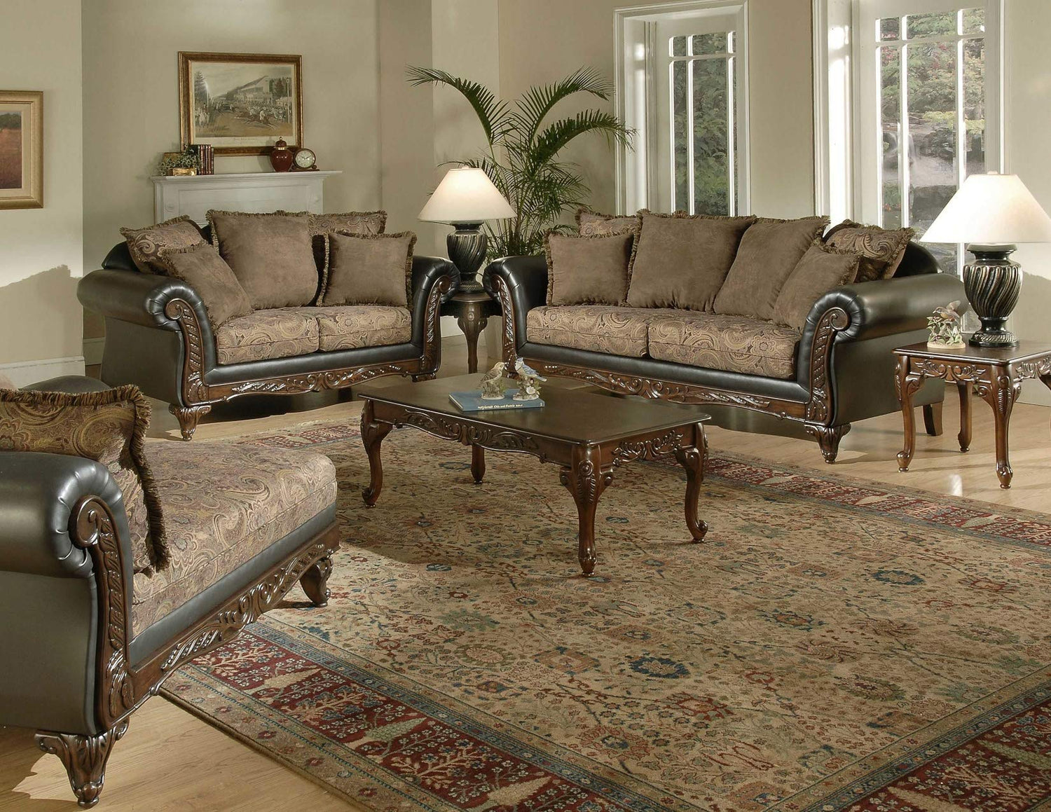 Details: The Classically styled pillow back San Marino Sofa Set is a beautiful combination of colors and fabrics that will bring warmth to any home. This sophisticated sofa set is covered in a rich coffee bean brown bi-cast material and the cushions and seat pillows in a contrasting floral pattern fabric. The traditional details and carved wood face trim add elegance and grace to your living room.