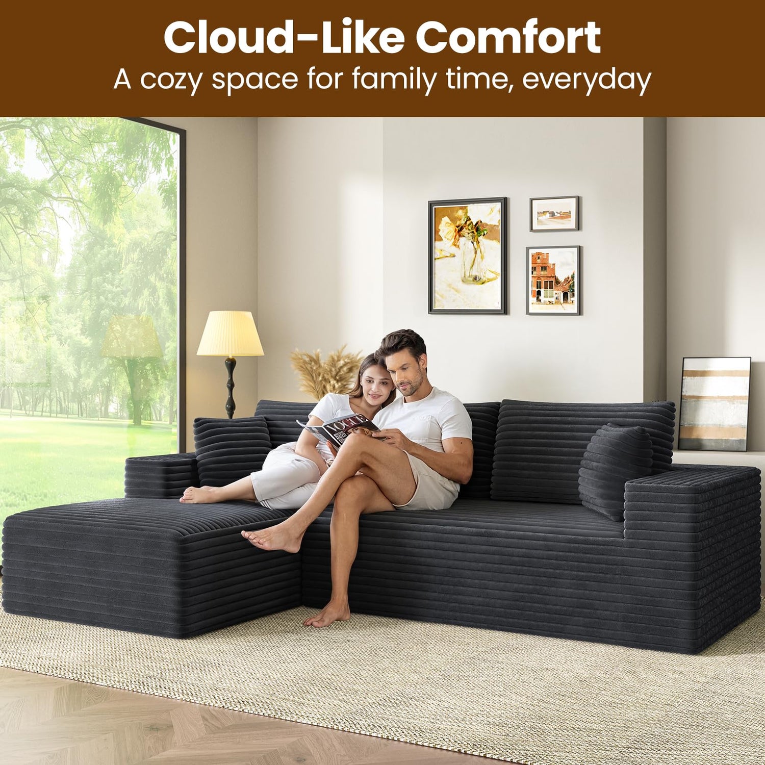 RRESTA 97" Cloud Modular Sectional Sofa, L-Shaped Couch with Left-Facing Chaise, Extra Deep-Seat Plush Corduroy, Comfy Fluffy Cushions, Side Pockets, Black, No Assembly Required, for Living Room