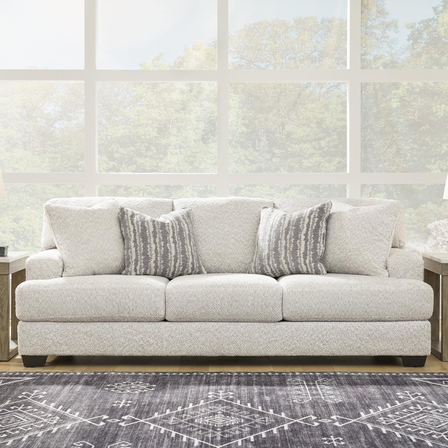 Details: This sofa speaks to those drawn to fresh, contemporary style with richly neutral appeal. Wrapped in a wonderfully plush fabric loaded with multi-tonal interest, this on-trend piece has a warm, welcoming charm. Coordinating accent pillows add to the indulgence. Kick back, relax and settle in for comfort with this cool addition for modern spaces.