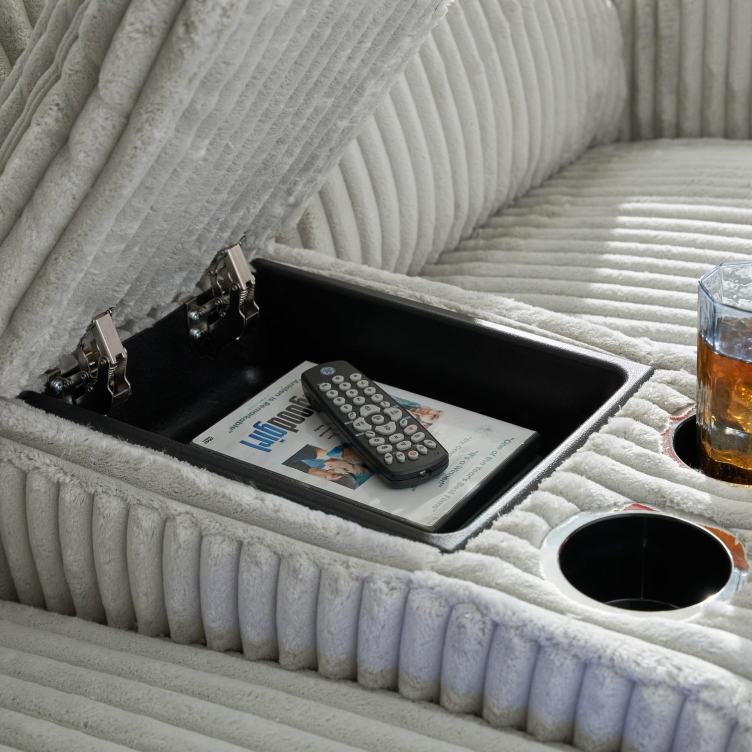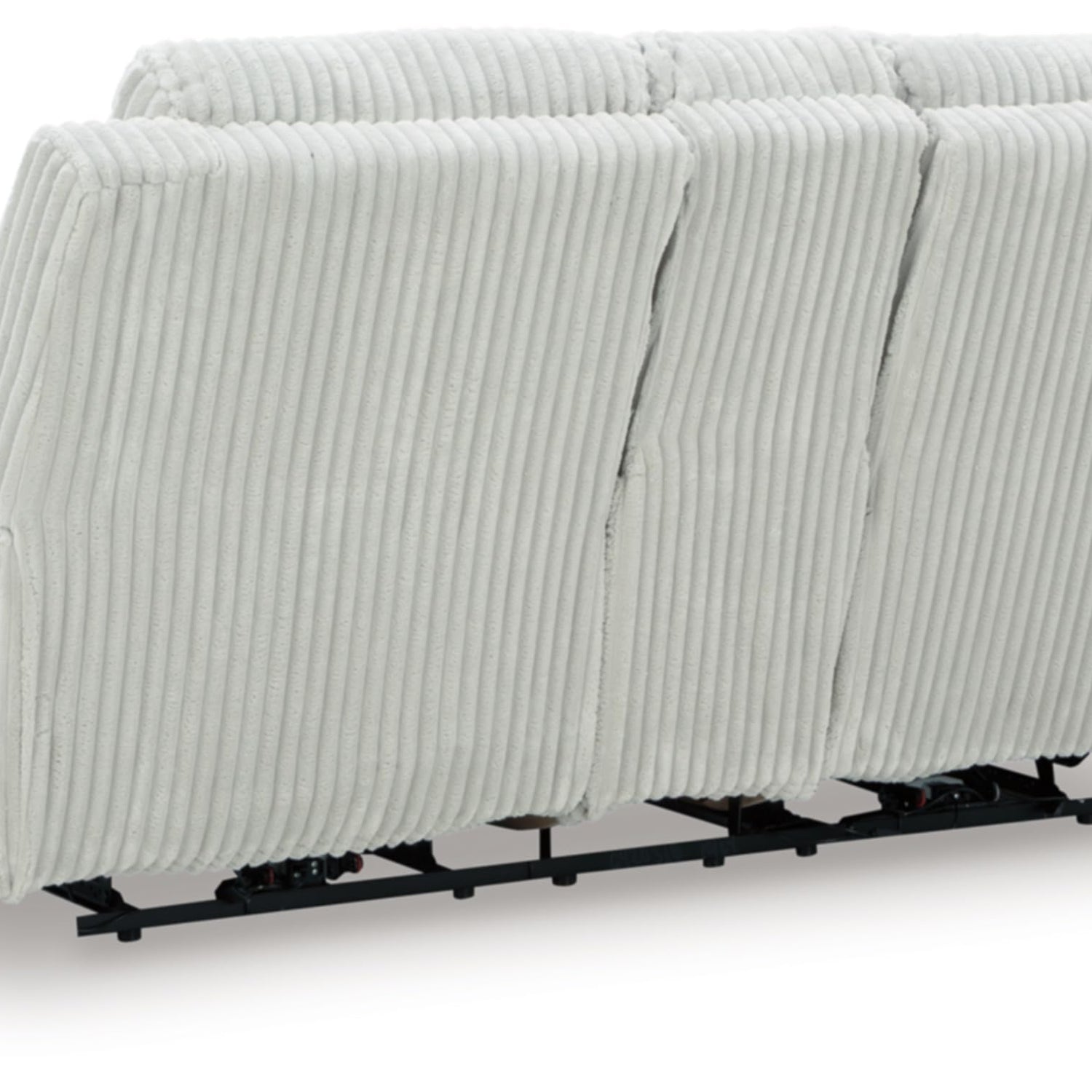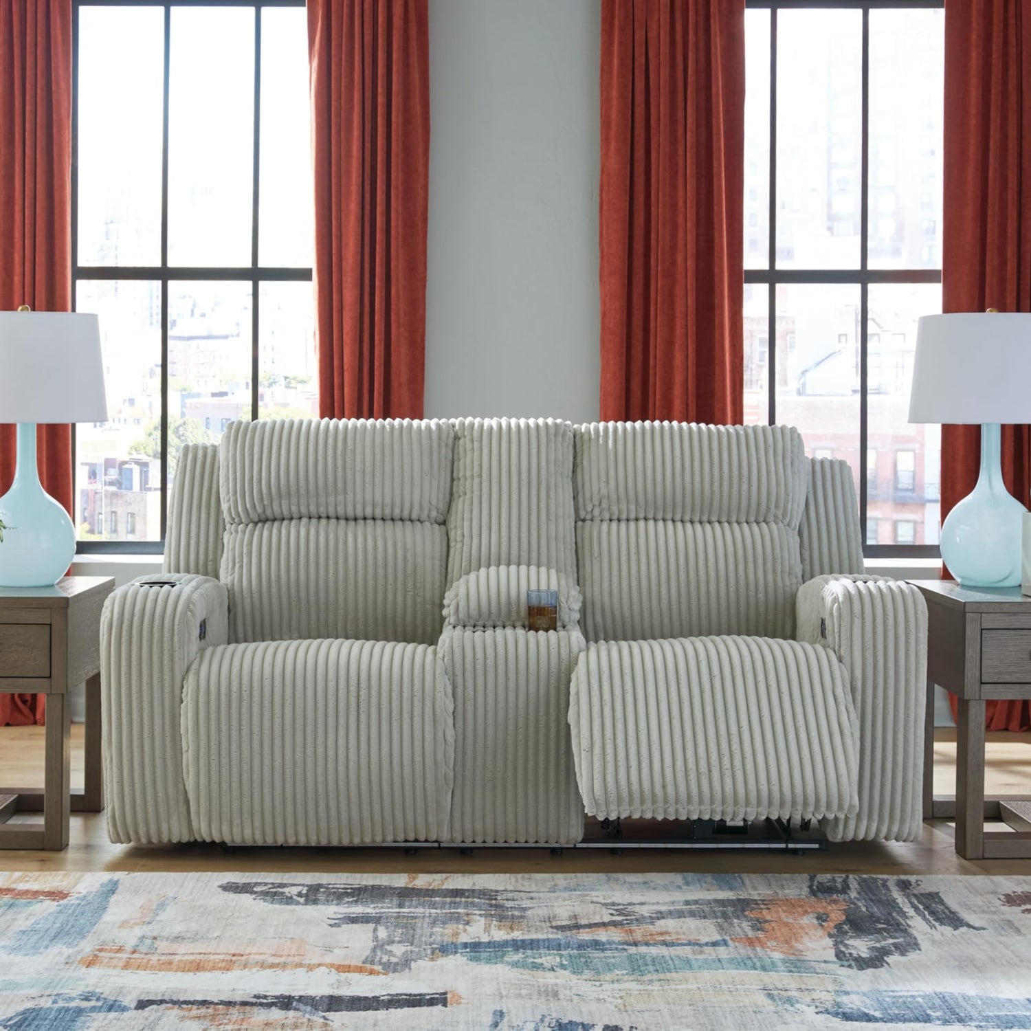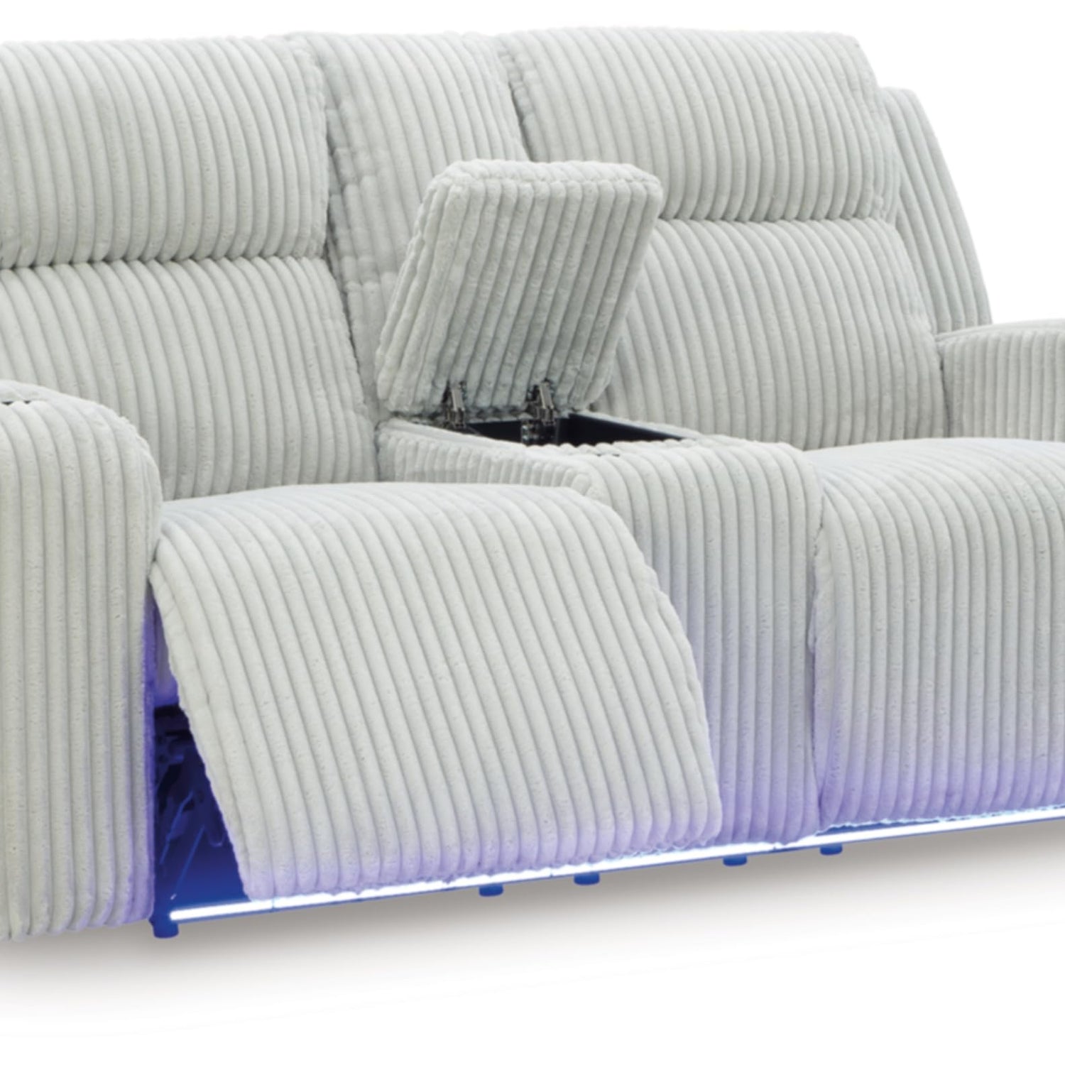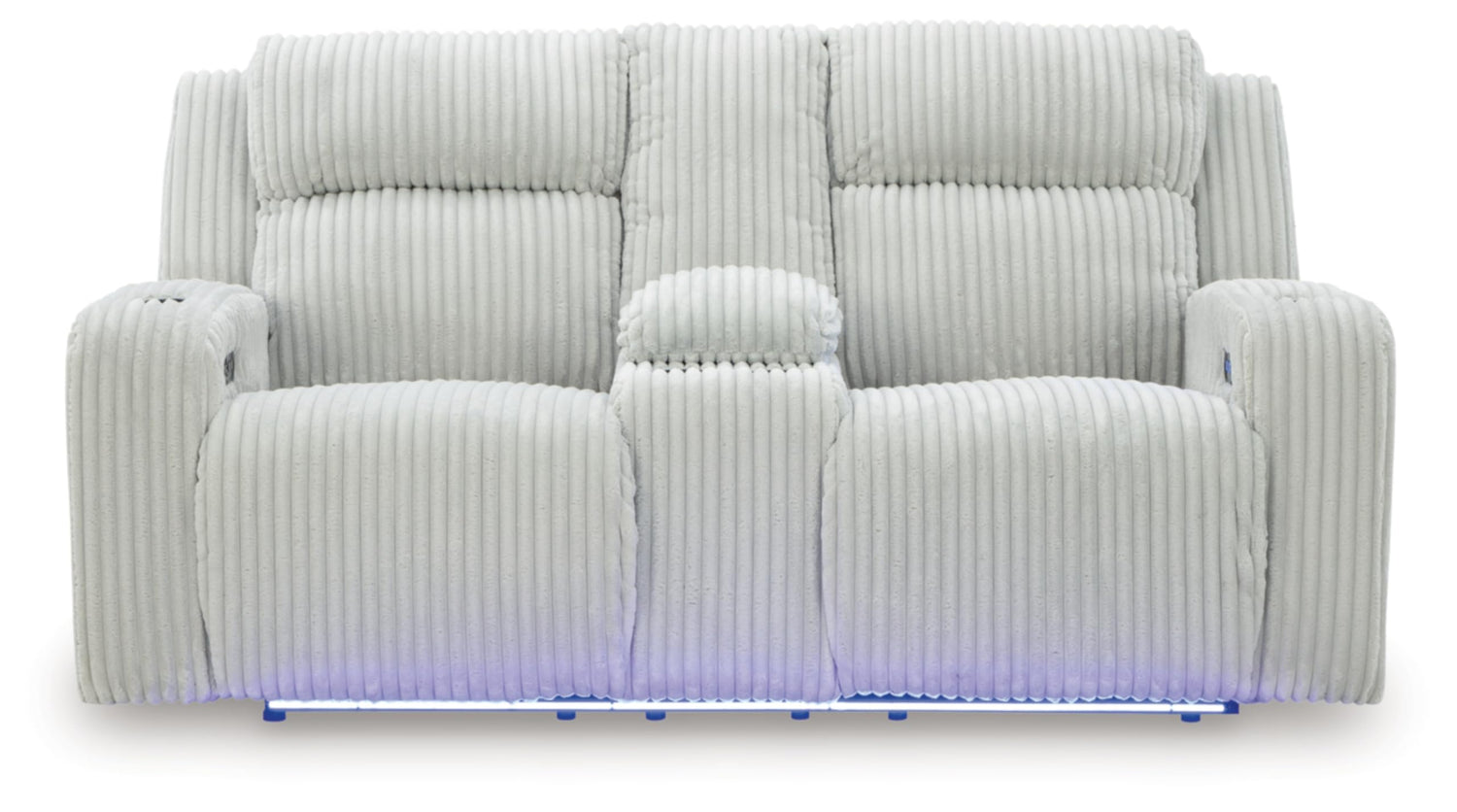 Details: Trend-right style, meet irresistible modern function. Your living room gets a cozy-cool upgrade with the TwinBrooke power reclining loveseat. Curl up in its ultra-chic corded upholstery and recline with one-touch controls. Is it movie night or game time? With ambient LED lighting, this loveseat transforms from a serene relaxation spot to an entertainment hub.