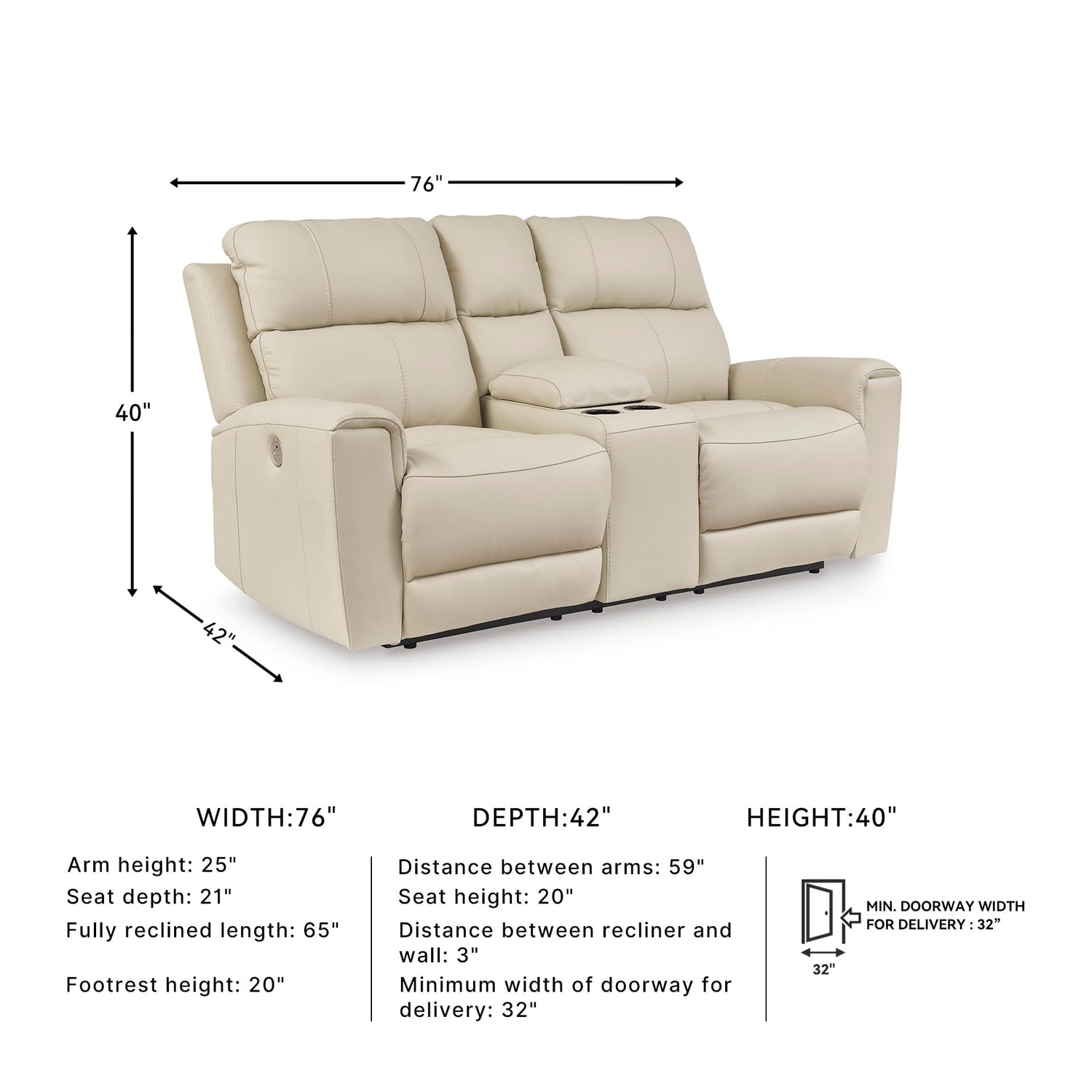 - DIMENSIONS: This item measures 76" W x 42" D x 40" H. Distance between recliner and wall should be at least 3". Fits through doorways 32" or wider. Center console with 2 cup holders and hidden storage