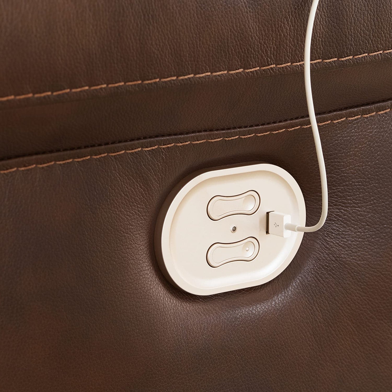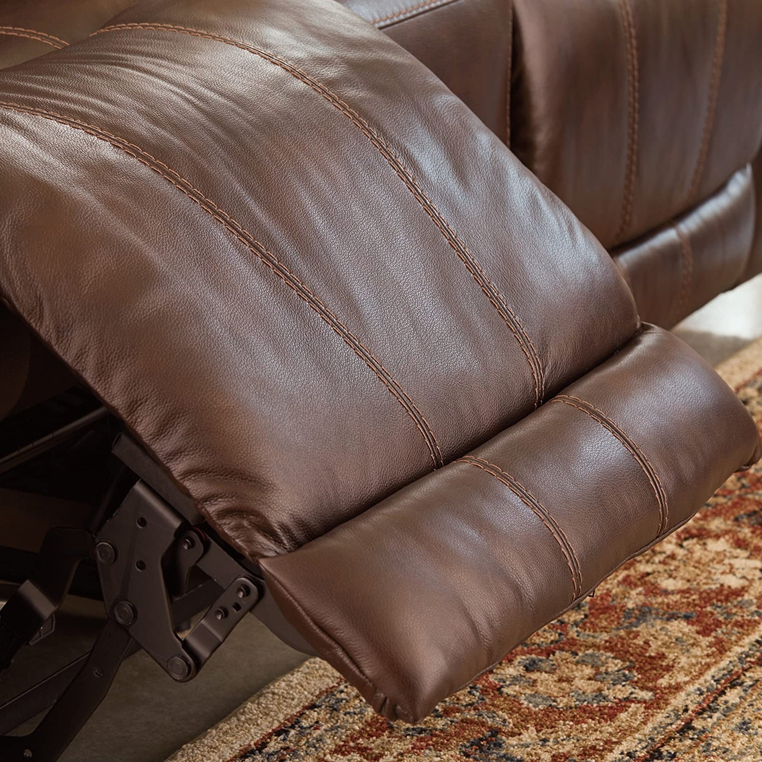 Details: When you curl up in the Edmar power reclining sofa with adjustable headrest, you won't want to get up. It has genuine leather throughout the seating areas, and a neutral brown chocolate hue that pairs up comfortably with most color schemes. This cozy sofa will be your go-to spot for watching TV, reading, or just closing your eyes and drifting off to sleep. Perfectly positioned cushions and overstuffed pillow top arms allow unparalleled relaxation. With a look that turns heads, this reclining sofa has an extended ottoman to enhance comfort, and an adjustable headrest for a primo view of the TV even when you're fully reclined.