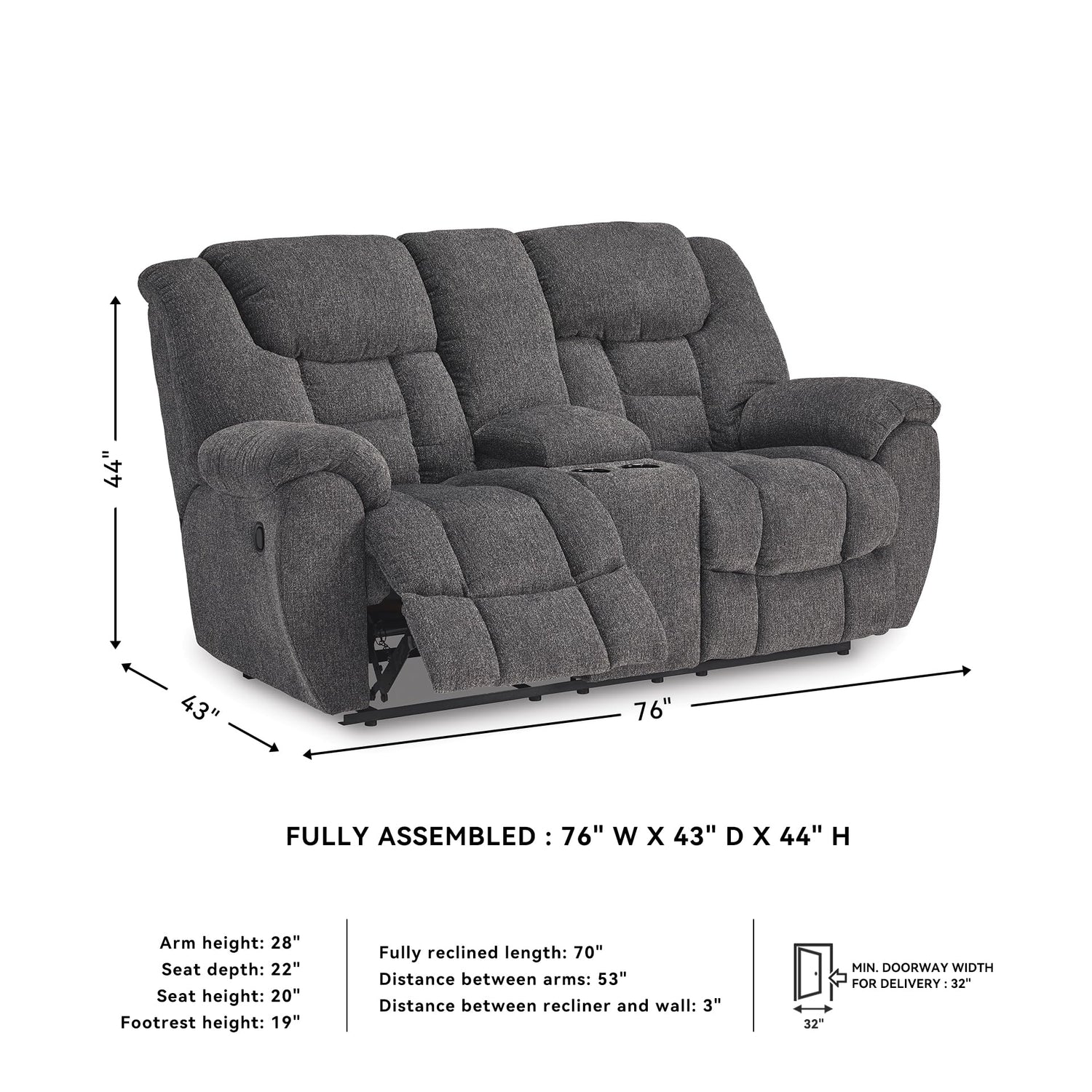 - DIMENSIONS: Measures 76" W x 43" D x 44" H. Fully reclined length: 70". Fits through doorways 32" or wider. Includes console with cup holders and storage