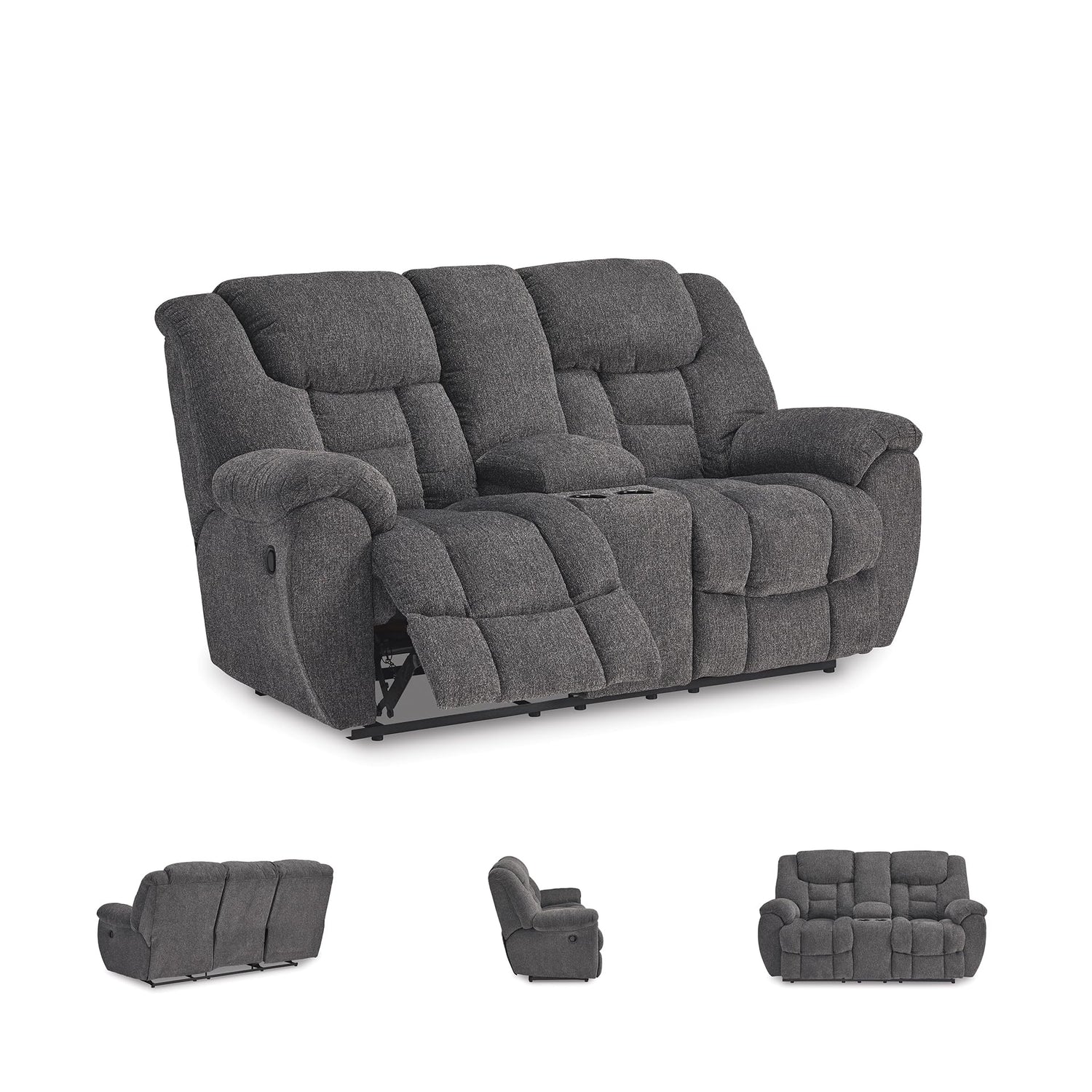 Details: Sometimes seeing is believing. And you can rest assured that this reclining loveseat with console is every bit as indulgent as it looks. Designed to put you in the lap of luxury, the generously scaled seating—wrapped in a wonderfully plush and practical charcoal gray Next-Gen Nuvella™ upholstery—sports pillow-wrapped armrests and curvaceously cushioned head-neck support for feel-good flair.
