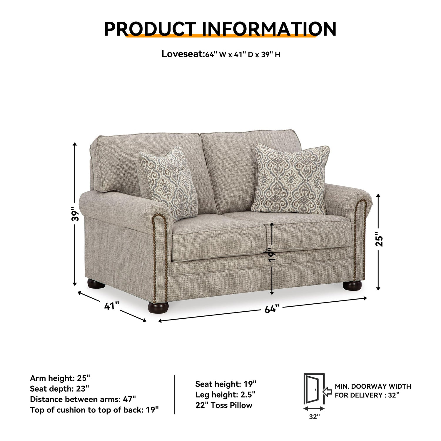 - HOME ESSENTIAL: Measures 64" W x 41" D x 39" H. Arm height: 25”. Seat depth: 23”. Seat height: 19”. Leg height: 2.5”. Distance between arms: 47”. Top of cushion to top of back: 19”