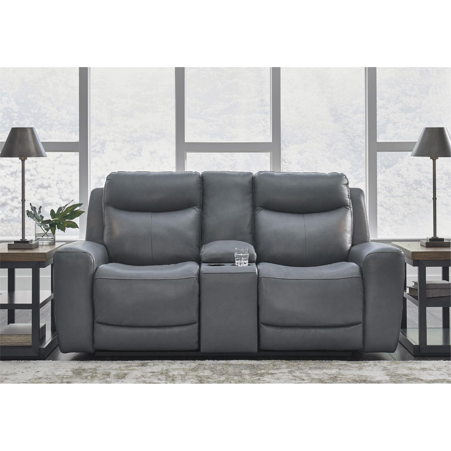 Signature Design by Ashley Mindanao Modern Leather Match Upholstered Power Reclining Loveseat with Console, USB Ports and Cup Holders, Gray