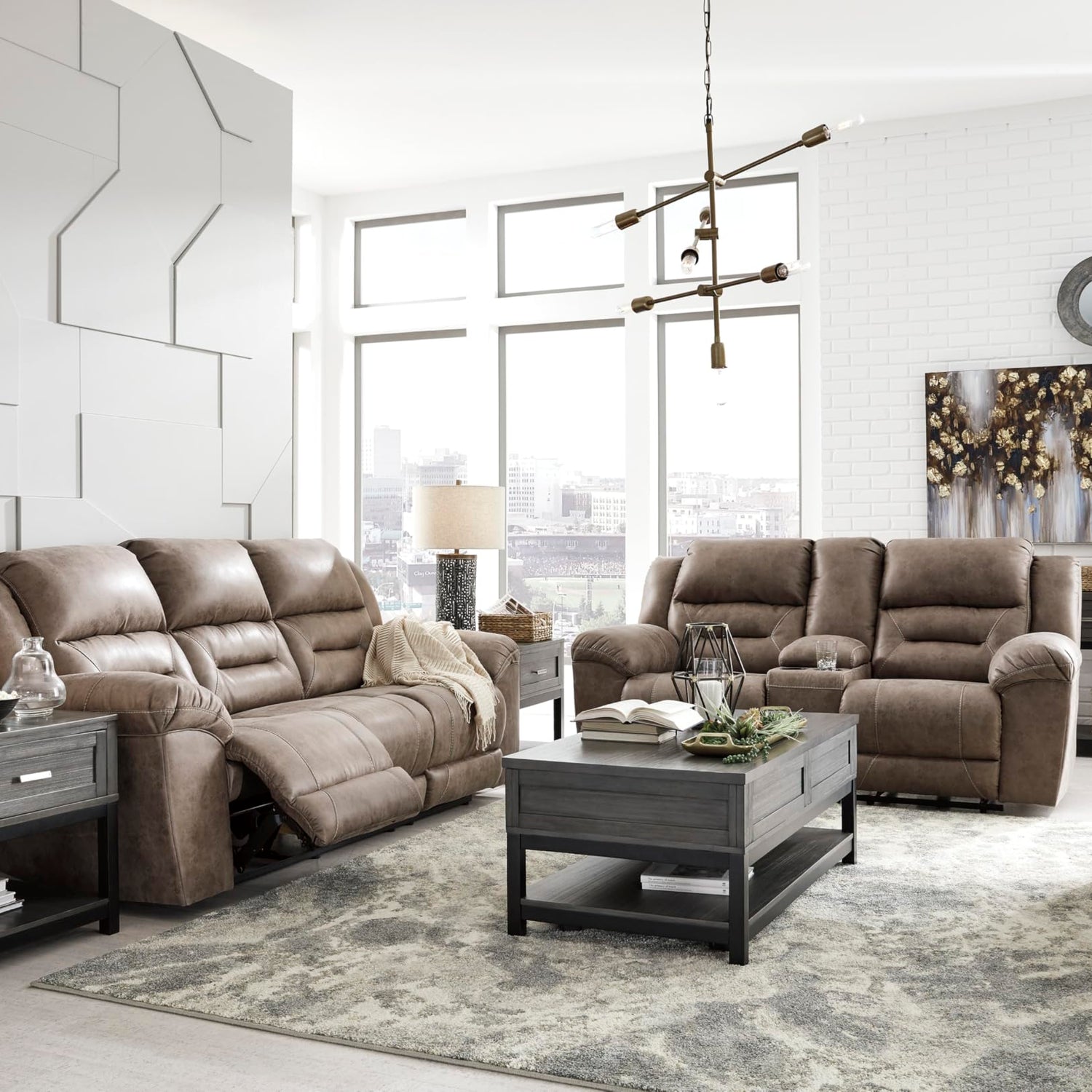 Signature Design by Ashley Stoneland Faux Leather Manual Pull Tab Reclining Sofa, Light Brown