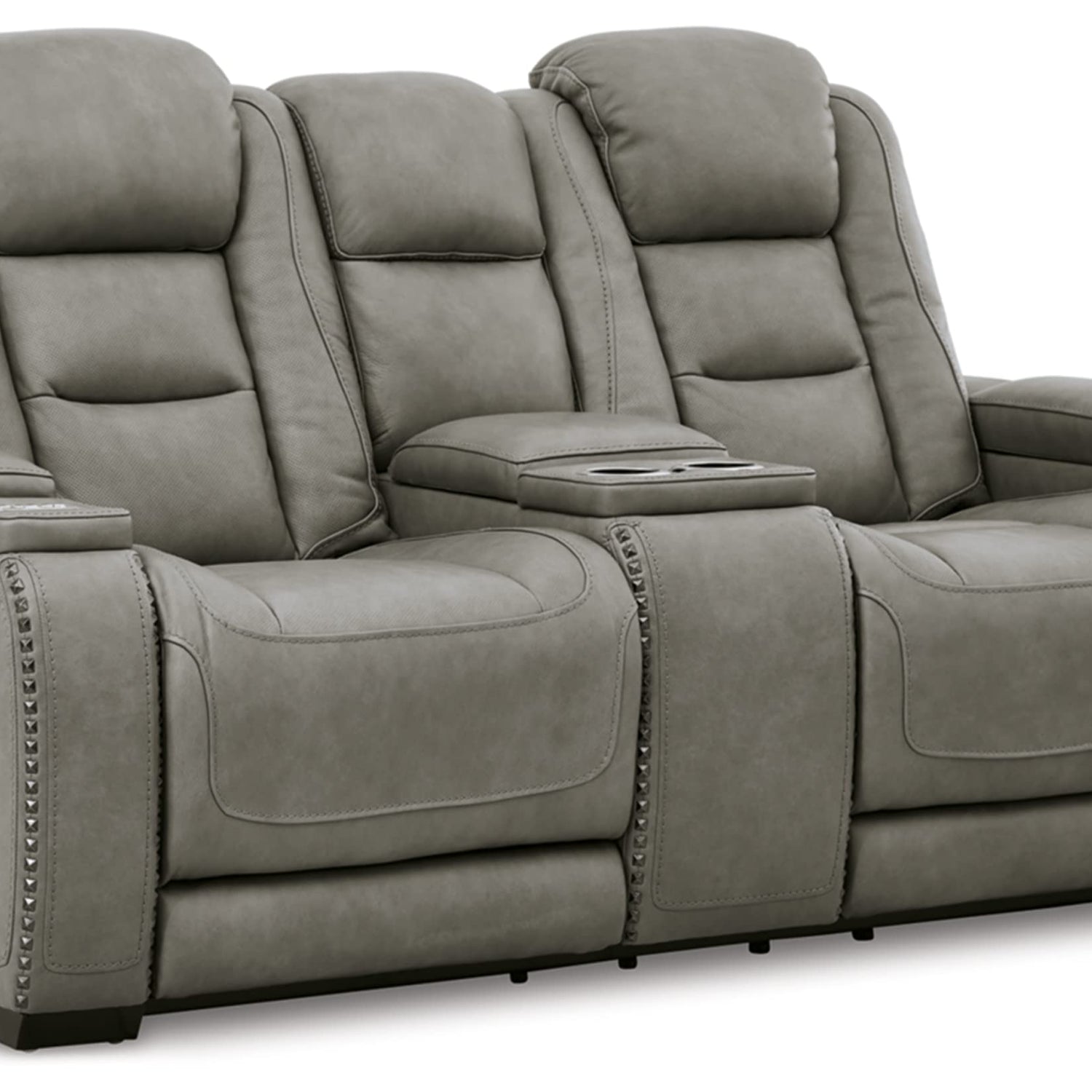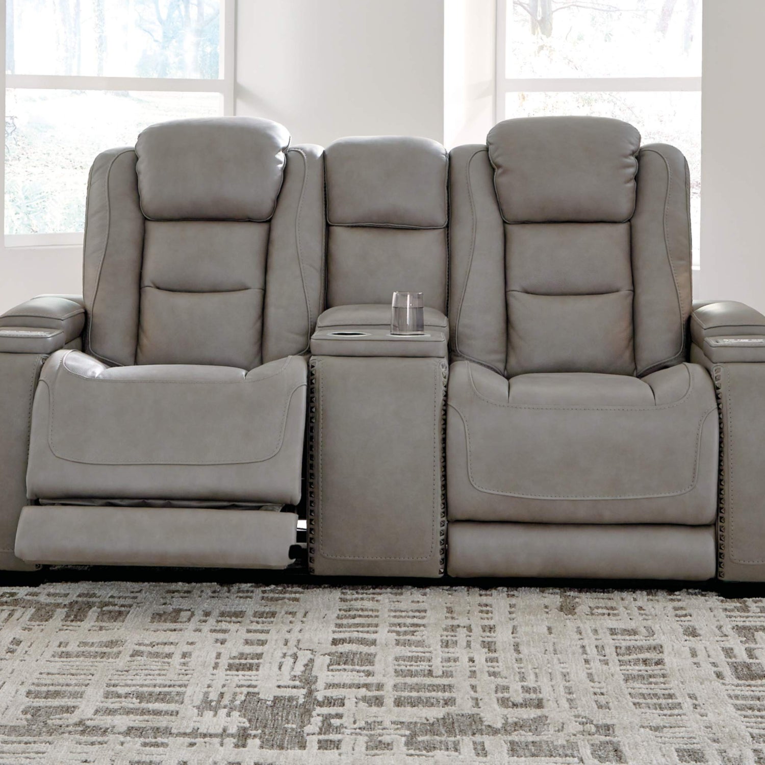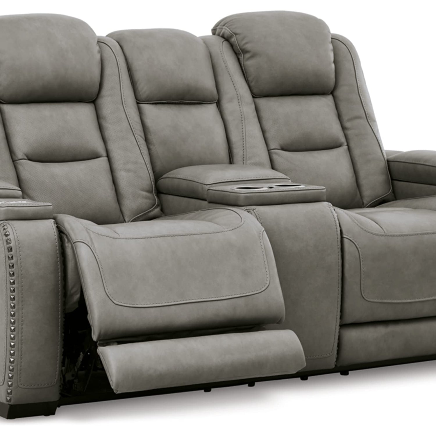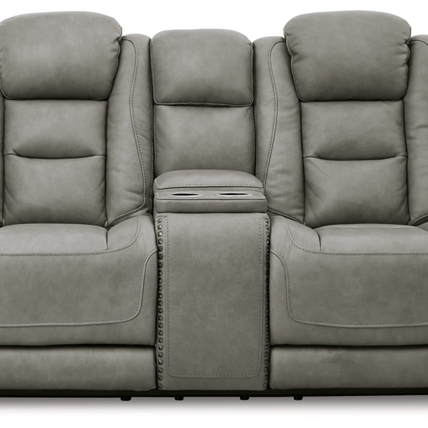 Signature Design by Ashley The Man-Den Leather Power Reclining Loveseat with Center Console, Adjustable Headrest & Wireless Charging, Gray