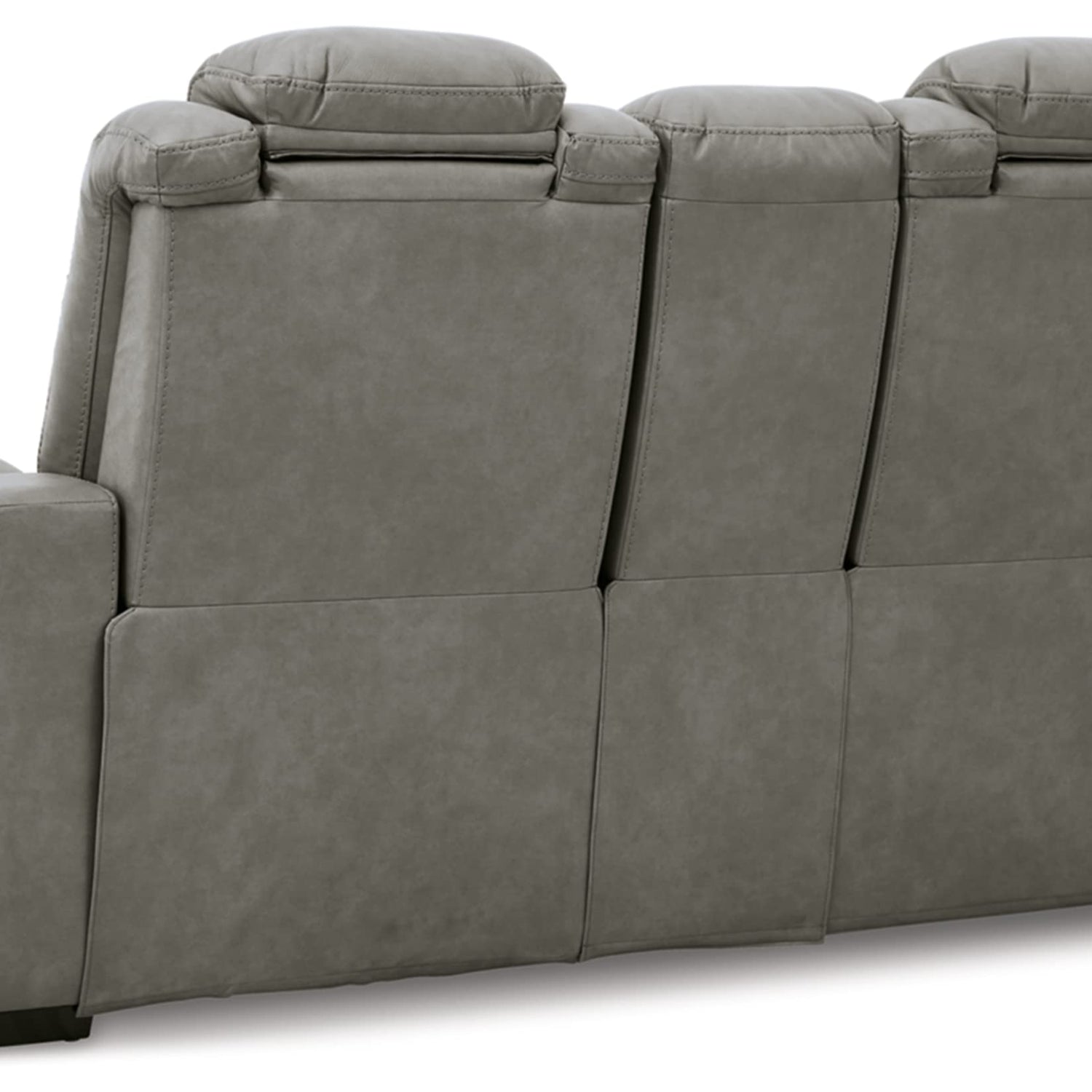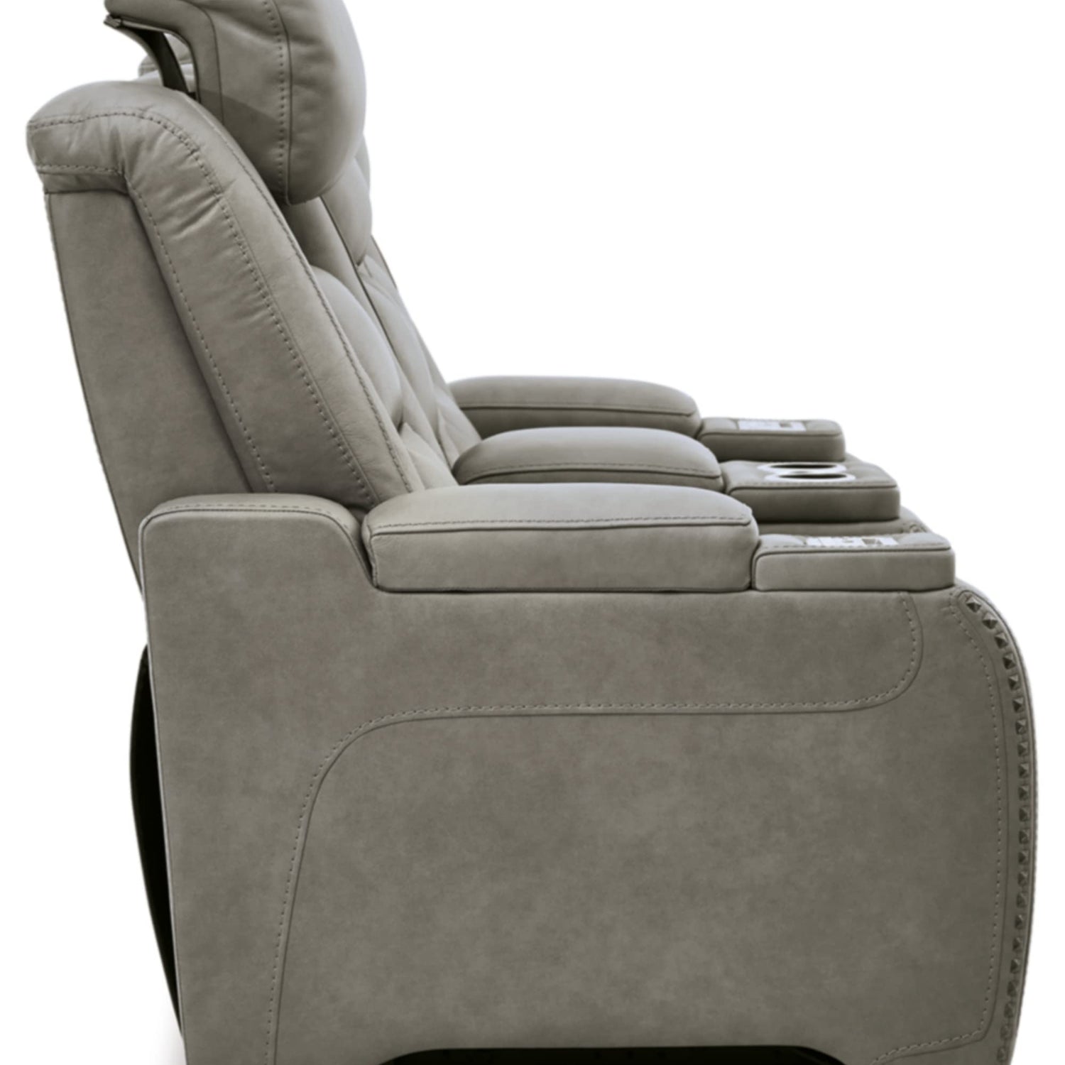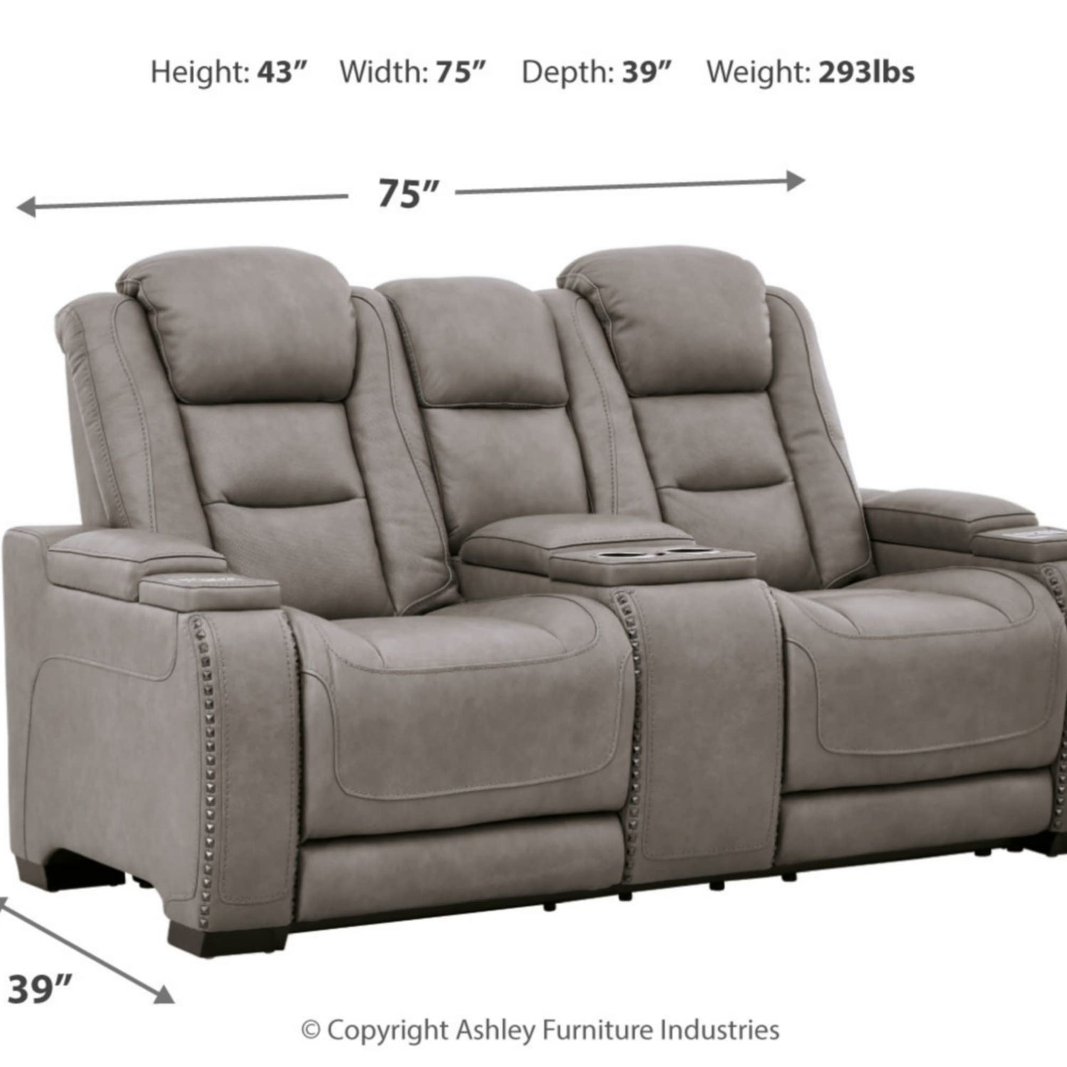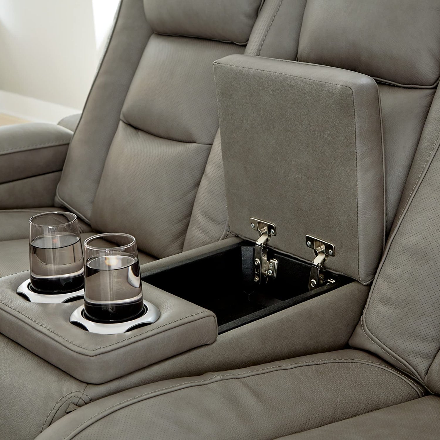 Signature Design by Ashley The Man-Den Leather Power Reclining Loveseat with Center Console, Adjustable Headrest & Wireless Charging, Gray
