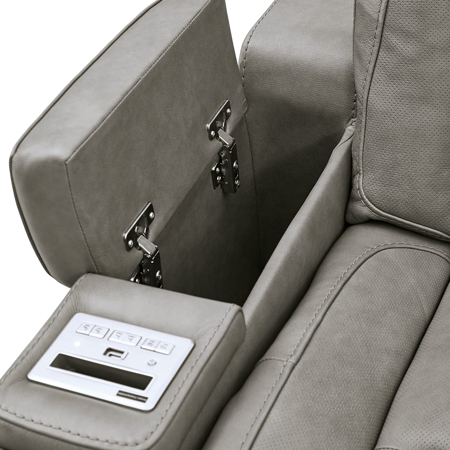 Details: Reserved for him and made for her, this power reclining loveseat in gray delivers all the comfort and style you could ask for. Inspired by sports car interiors, the seating area is covered in real leather for your pleasure, with a "perforated automotive" treatment for that much more appeal. Positioned at your fingertips, the advanced one-touch power control puts you in the driver’s seat with everything from an Easy View™ power headrest and power lumbar support, to a USB port and wireless charging for your phone. Talk about fully loaded. And with integrated cup holders and hidden storage compartments under the posh, padded armrests, this designer power reclining loveseat makes the most of every inch of space.