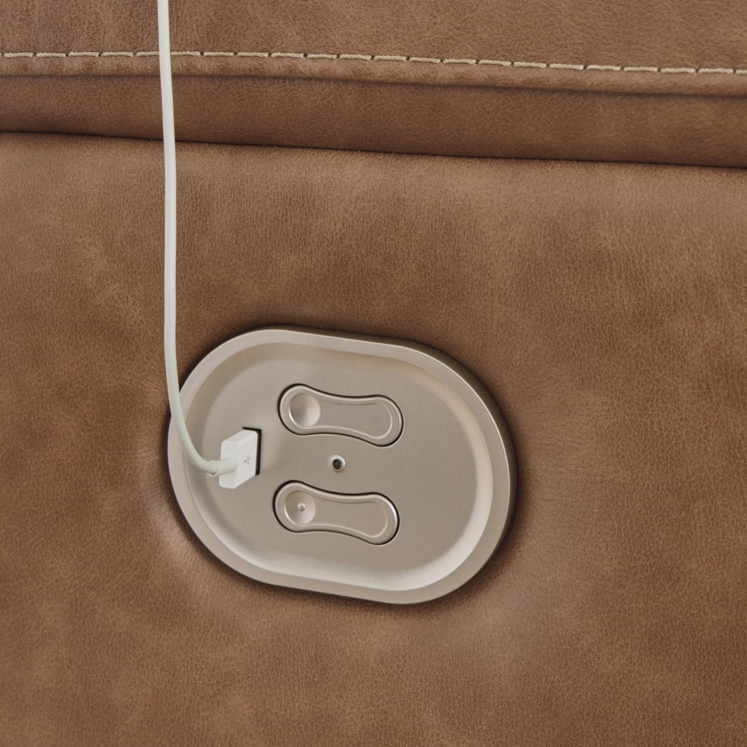 Details: This power reclining loveseat delivers comfort and contemporary style in a big (but not bulky) way. Its supple leather and faux leather upholstery, sumptuous cushioning and one-touch control are sure to take you to your happy place. The loveseat's power adjustable headrests let you fully recline and still be perfectly positioned to watch TV or read. And thanks to the convenient USB port, charging while chilling has never been easier.