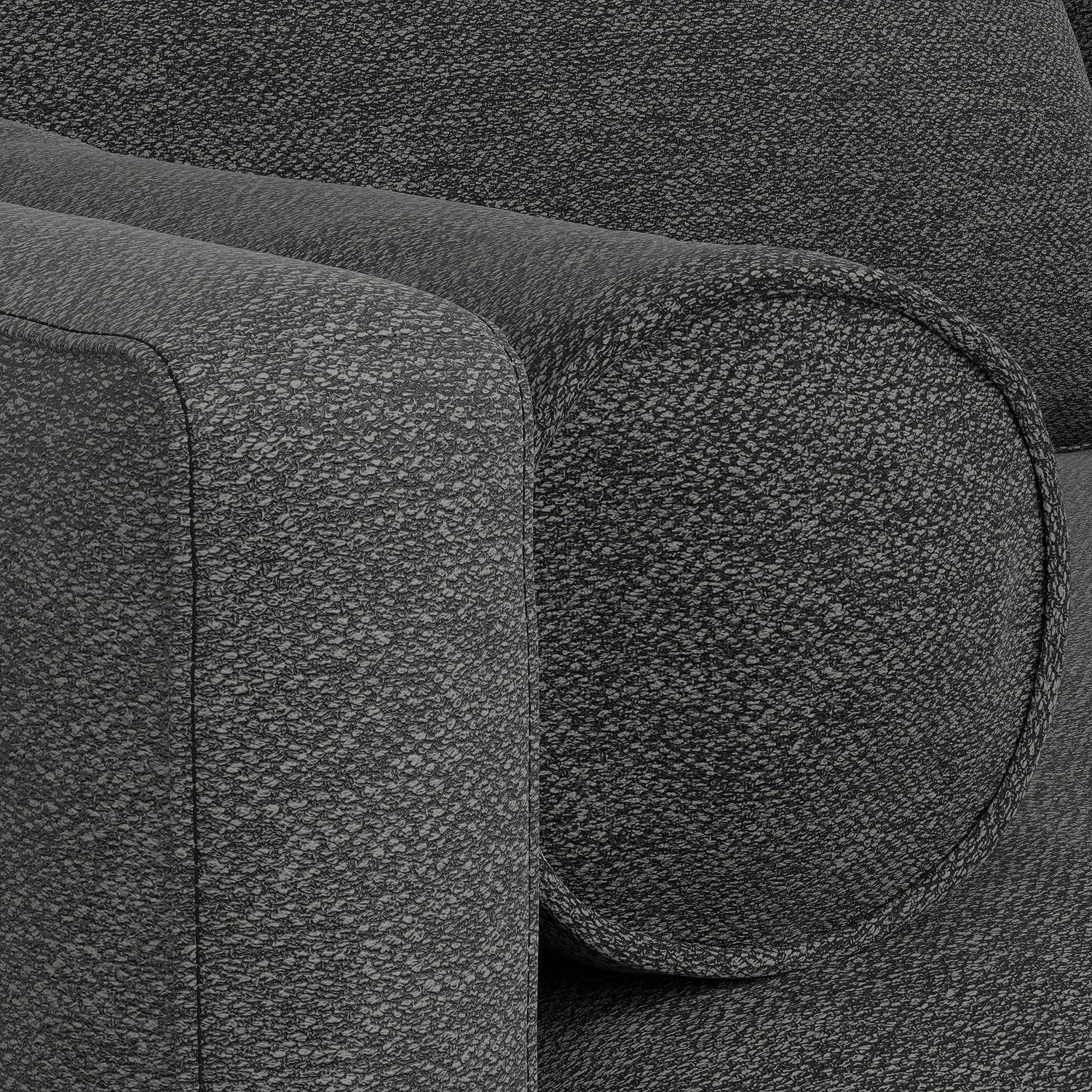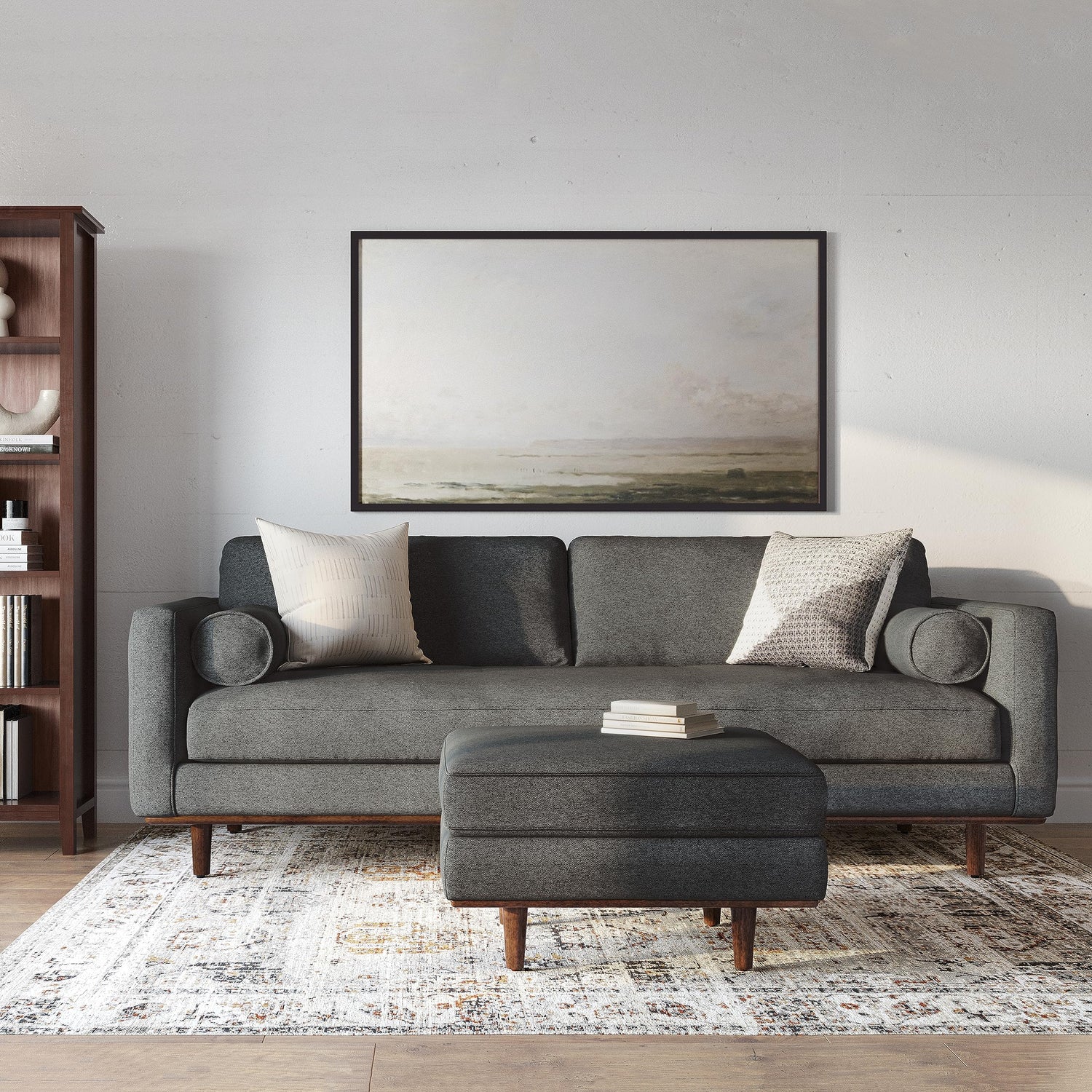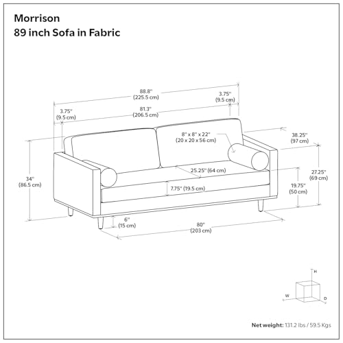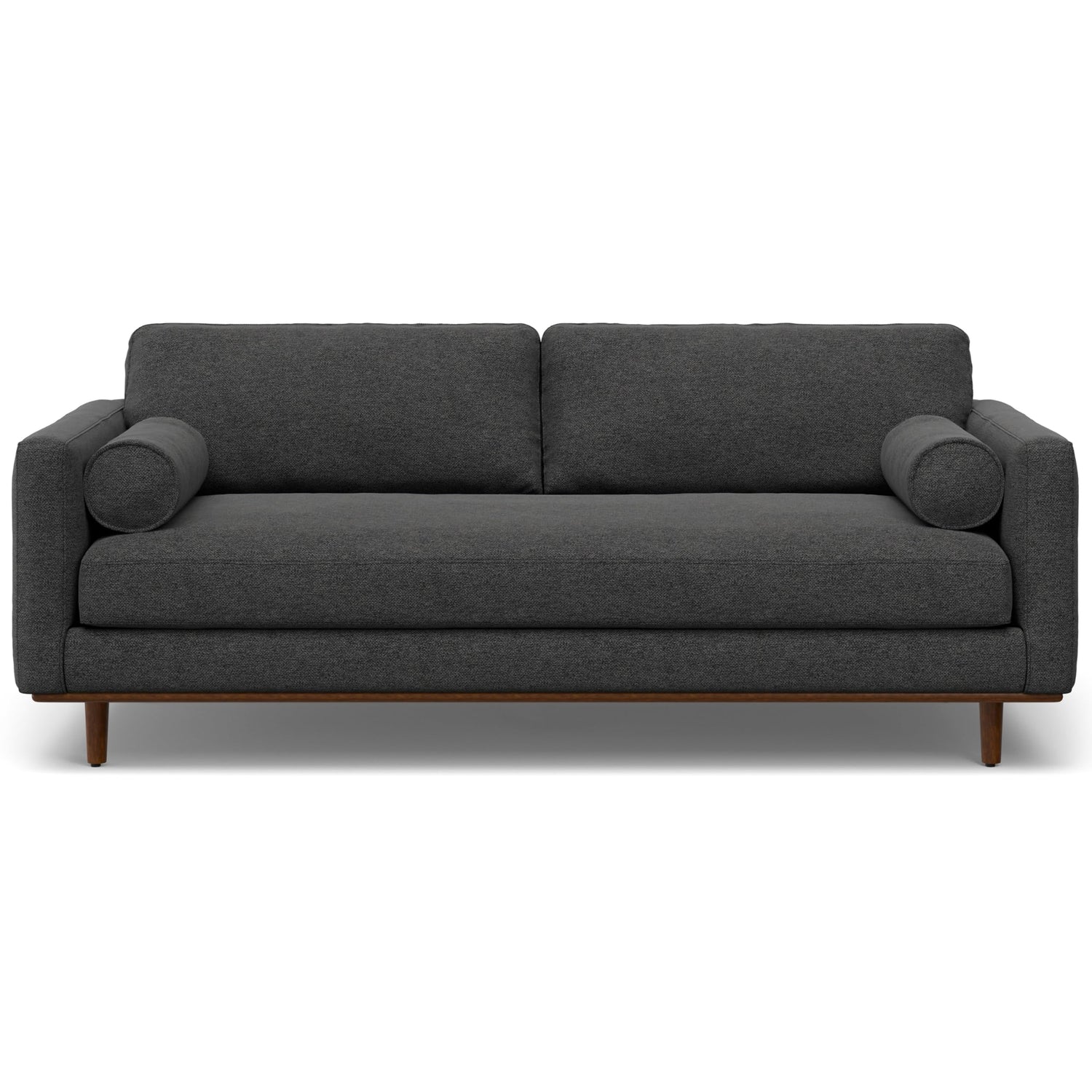 Details: Transform your living space with the Morrison 89-inch Sofa, a mid-century modern masterpiece that combines style and comfort. This handcrafted sofa features a spacious single bench cushion, perfect for sprawling out or cozying up with family. Upholstered in charcoal grey woven-blend fabric made with 56% recycled polyester, it's both eco-friendly and durable. The generous 89-inch width comfortably seats three, making it ideal for movie nights or entertaining guests. With its solid wood frame and high-density foam cushions, this sofa offers lasting support and comfort for everyday use. The two loose back cushions and bolster pillows add extra versatility, allowing you to customize your seating experience. Designed for real life, this sofa combines functionality with timeless elegance, making it a standout piece in any home.