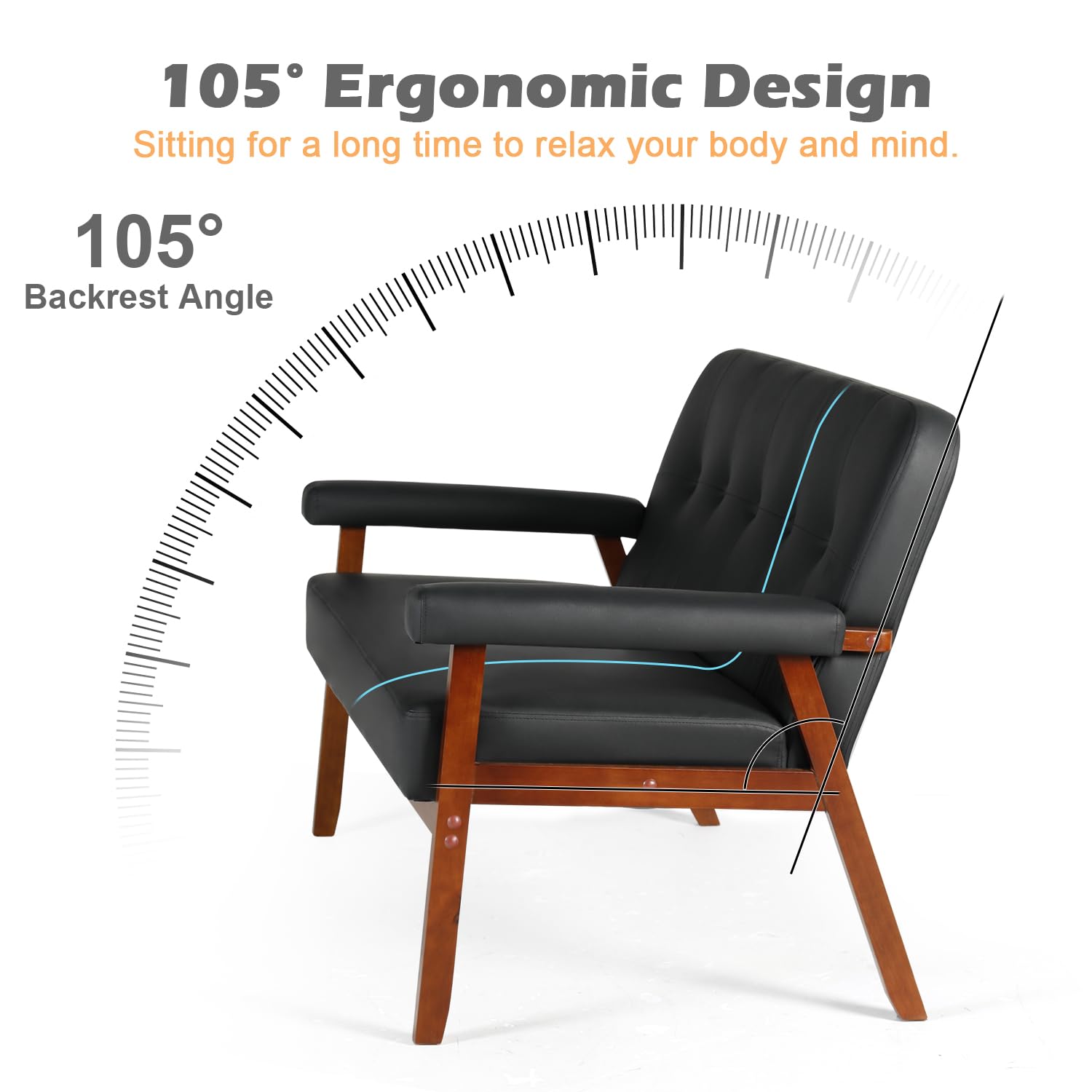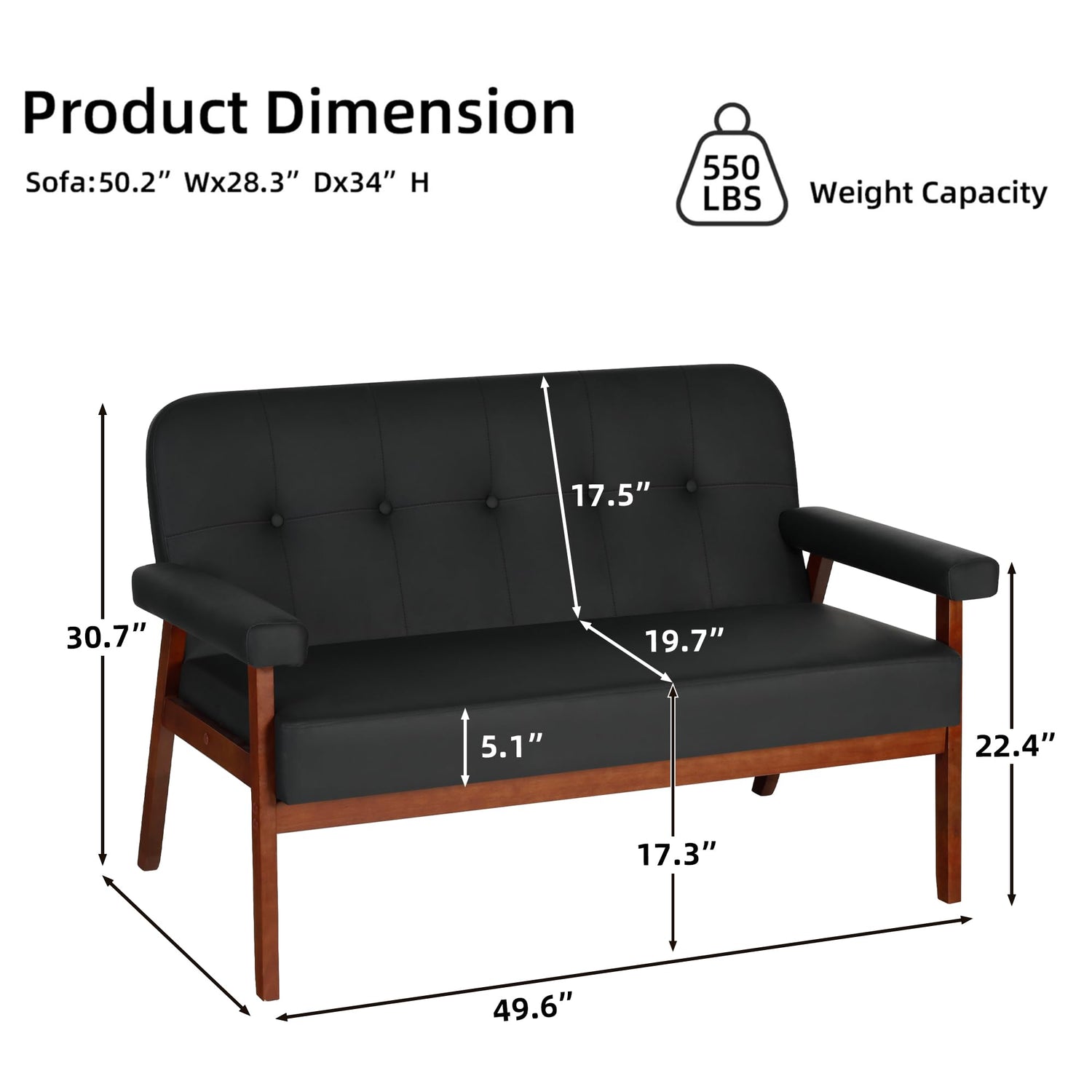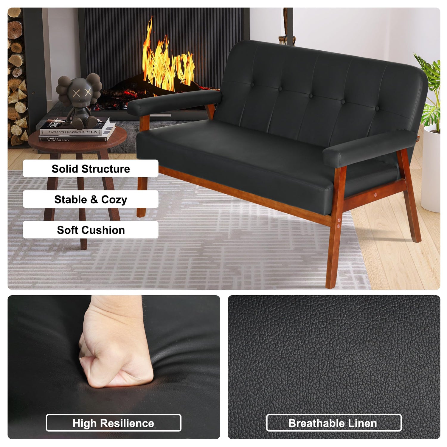 STHOUYN 50”W Black Faux Leather Small Office Couch Loveseat Sofa with Wood Arms, Mid Century Modern Love Seat Sofas Lounge Armchair Living Room Bedroom (Black (loveseat))