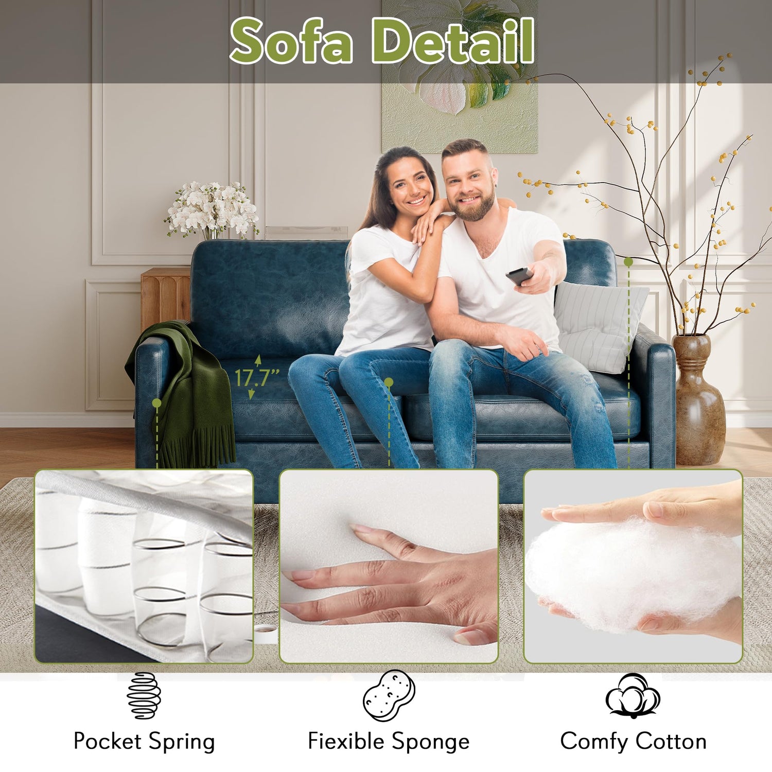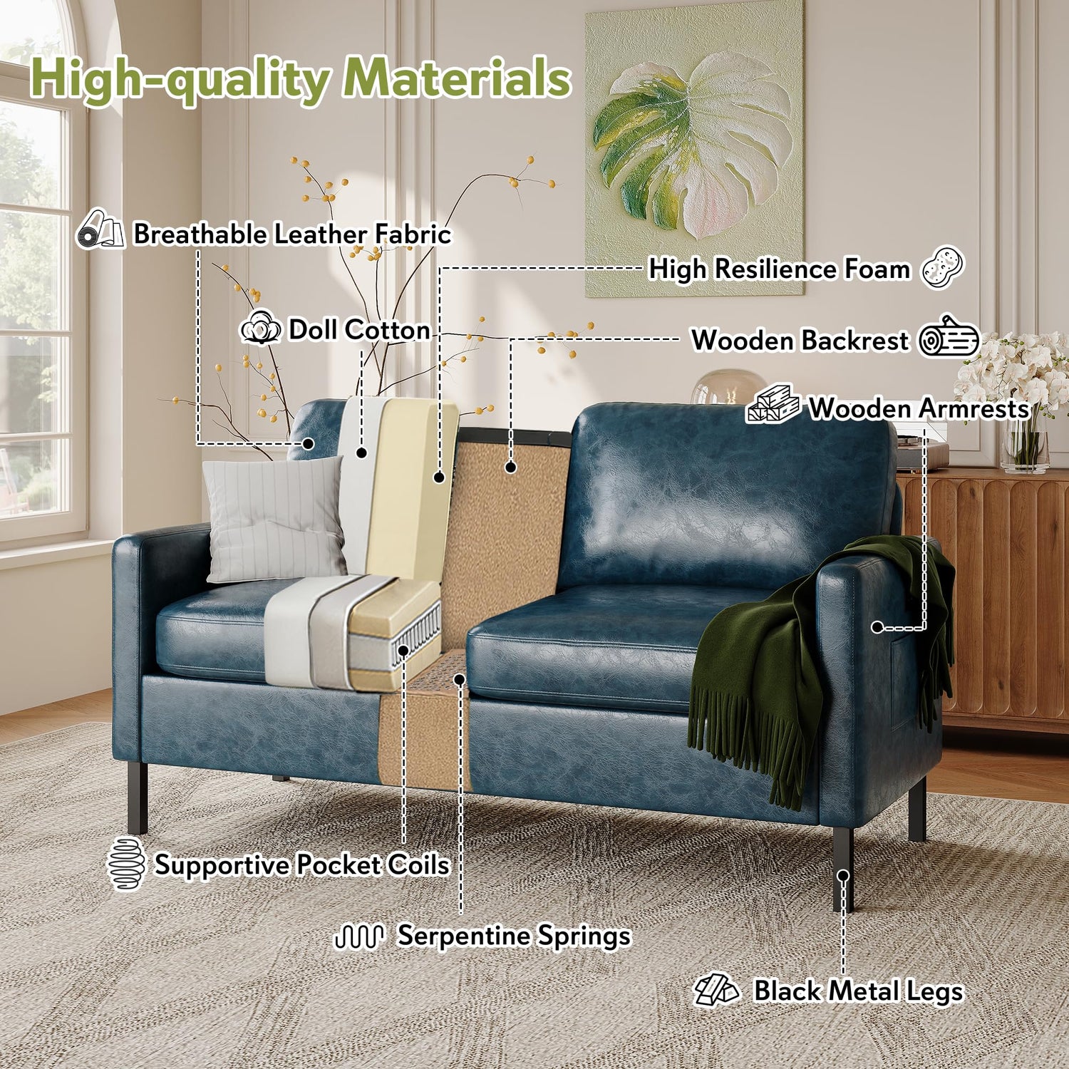 - Premium Blue Faux Leather & Space-Smart Design: This small loveseat sofa (57"W) features vibrant blue faux leather couch upholstery resistant to stains and spills—simply wipe with a damp cloth for instant cleaning. The compact footprint fits seamlessly in dorm rooms, apartments, or as a blue office couch beside workstations, maximizing space without sacrificing style. Rounded corners on arms and cushions enhance safety in narrow areas while adding mid-century modern flair.