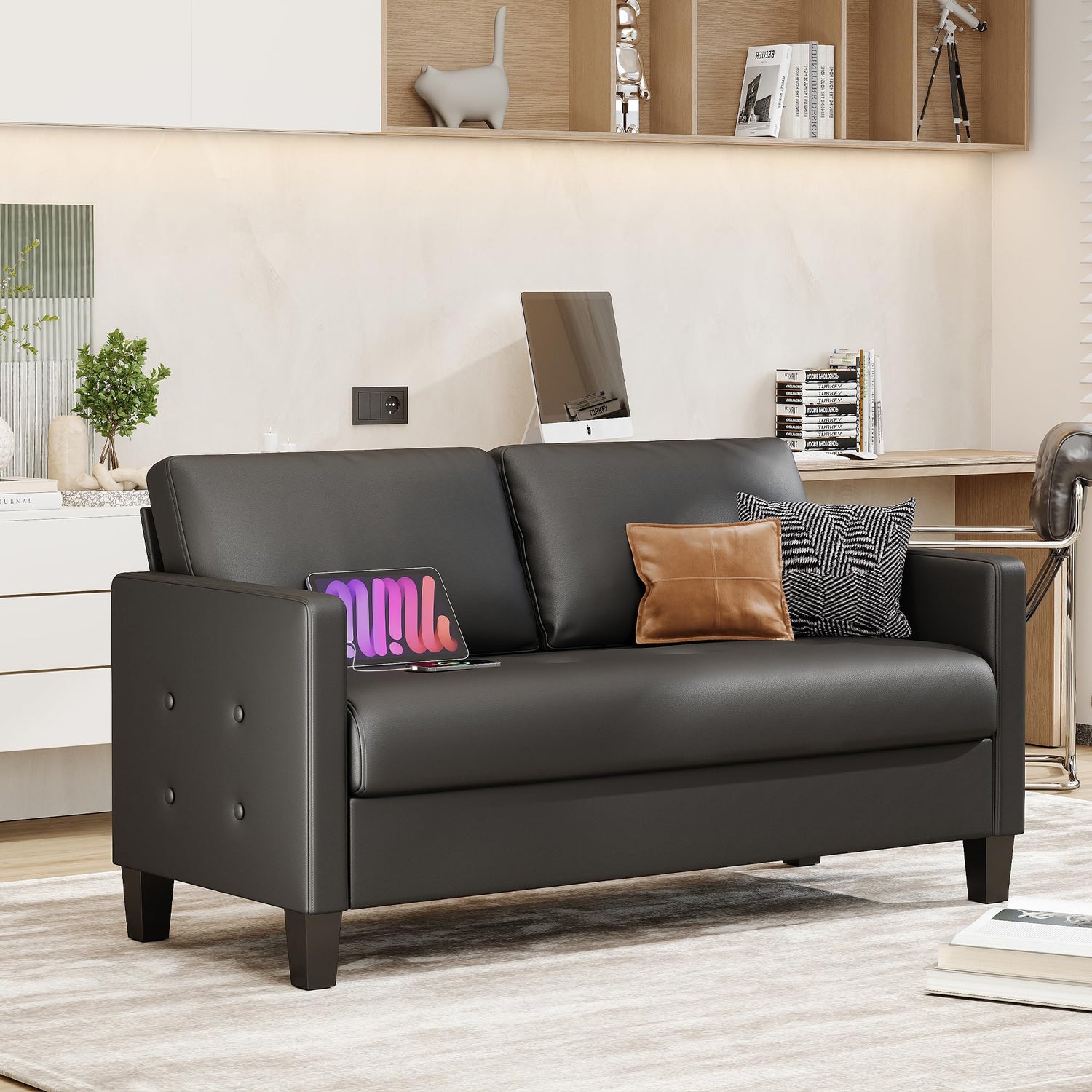STHOUYN 59” Black Faux Leather Sofa Couch, Modern Comfy Office 2 Seater Couch Loveseat with USB and Tufted Armrest, Small Love Seat Couches for Living Room, Bedroom, Apartment