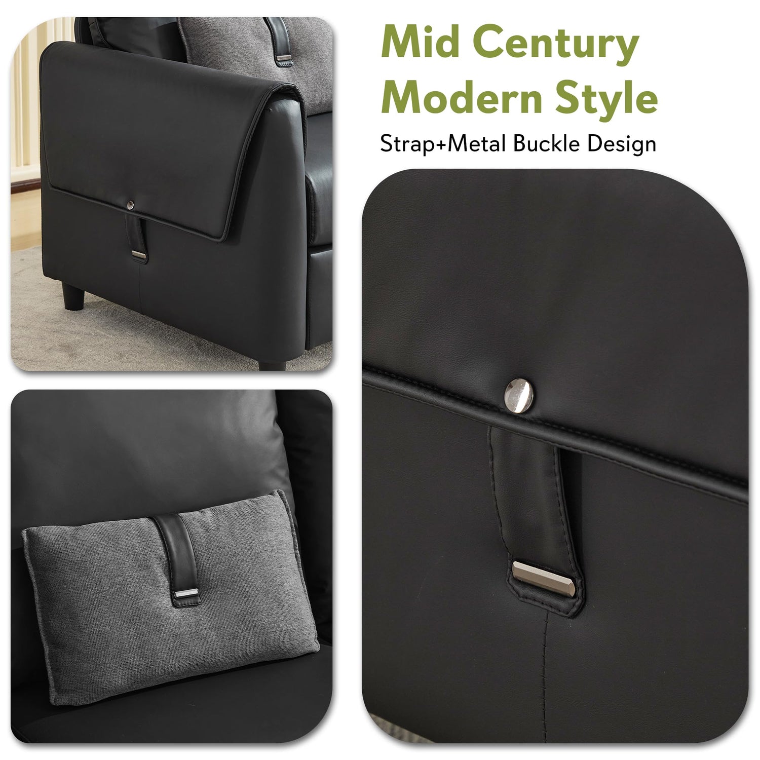 • Sleek Modern Design: This faux leather couch combines premium black faux leather and dark grey linen-look fabric, accented with stylish metal buckle details. Its contemporary silhouette adds a touch of sophisticated elegance to any living room, office, or lounge space, making it a perfect black couch for modern interiors.