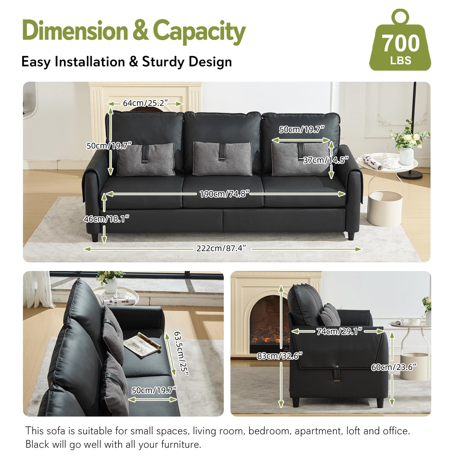• Sturdy & Stable Structure: Built with a solid wood frame and reinforced steel support in the backrest, this black leather couch ensures long-lasting durability and a remarkable weight capacity of up to 700 lbs. Added center support legs under the base further enhance stability and safety.