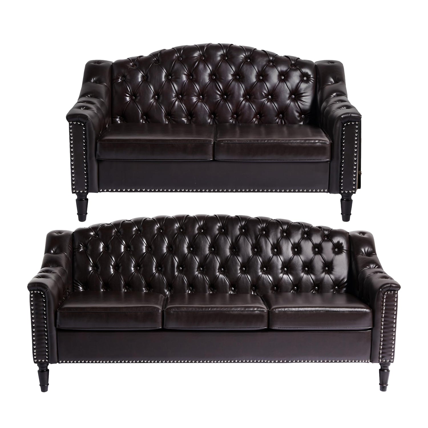 SUJOUCRAFT Chesterfield Camelback Loveseat & 3 Seater Sofa, Mid-Century Living Room Leather Upholstered Leather Sofa Sets, Sofa Couch Sectional with Deep Seat Tufted Backrest (PU-Camelback-2+3, Brown)