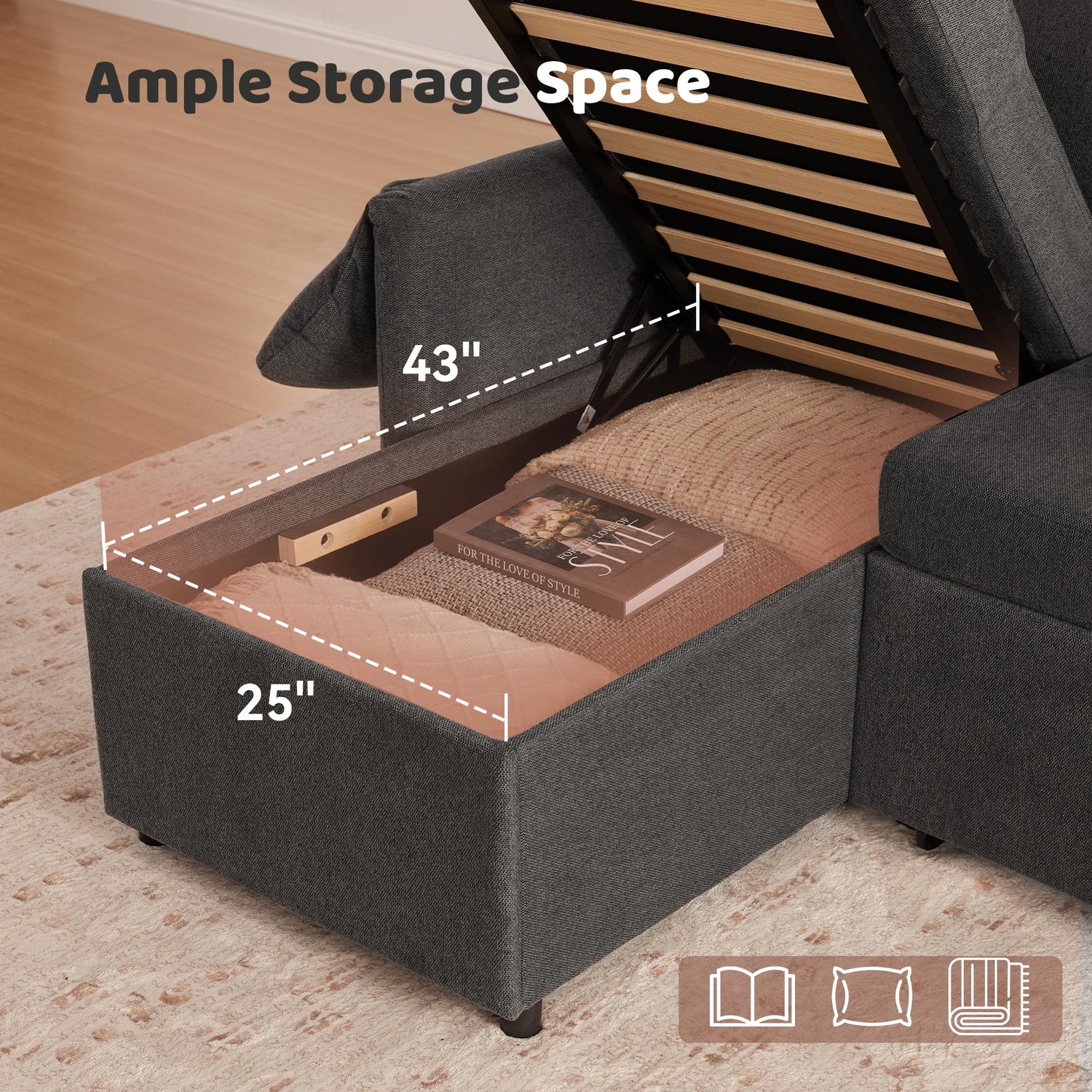 - SLEEPER SOFA WITH CHAISE & STORAGE: Our sleeper sofa with r eversible chaise which can be on the right or left side. You can build the position and shape you like. Built-in large storage space is easy to access and spacious enough to store blankets, bedding, pillows, books or anything you want, save your space while keeping your home neat.