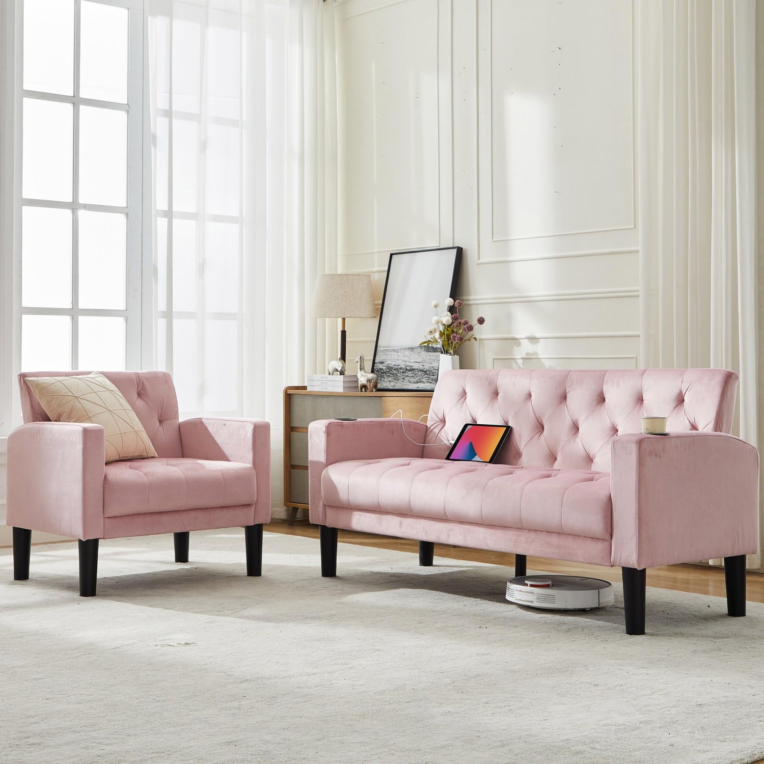 TYBOATLE Mid-Century Modern Sectional Sofa Sets 2 Pieces, Tufted Linen Fabric USB Loveseat Couch w/ 2 Cupholders and Accent Arm Chairs for Living Room, Bedroom, Apartment (Pink)