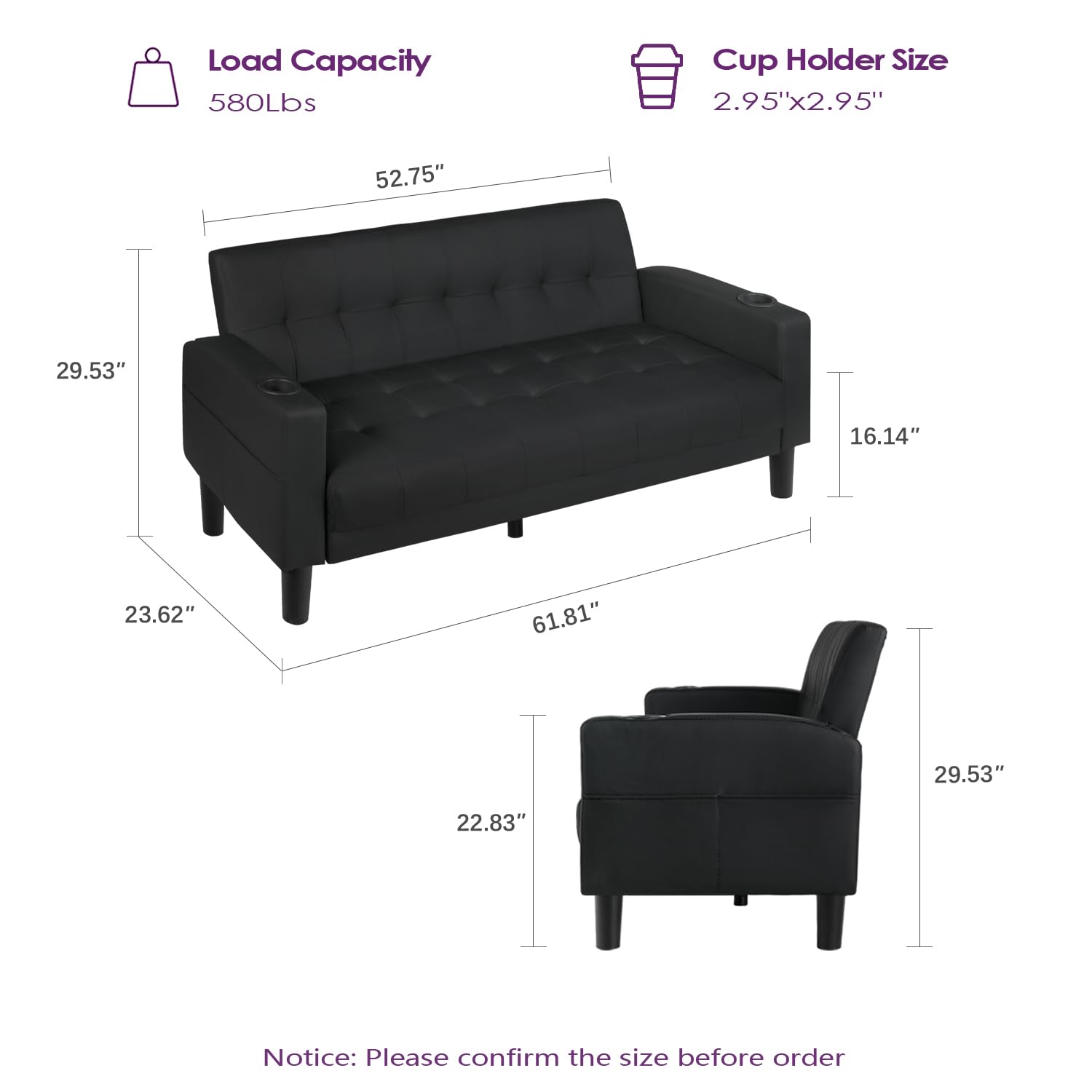 • 【SPECIFICATIONS】61.81"(L) x 23.62"(W) x 29.92"(H); Weight Capacity: 400 lbs. This small sofa is perfect for the office, living room, bedroom, lounge,dorm,reception, meeting room.