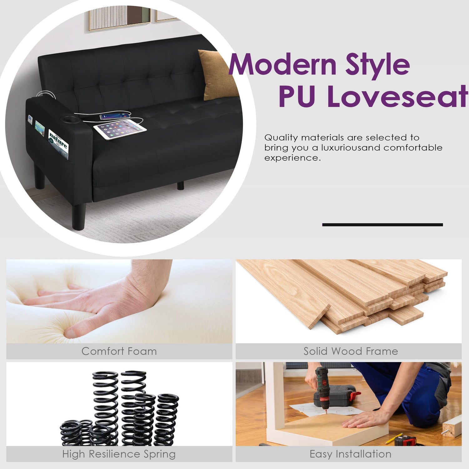 • 【COMFORTABLE USB LOVE SEAT】This mid-century modern sofa from us offers maximum comfort and technology. The breathable leather soft to the touch, with 2 convenient muebles cup holder feature and charging function. It's perfect for lounging in front of the TV or a roaring fire.