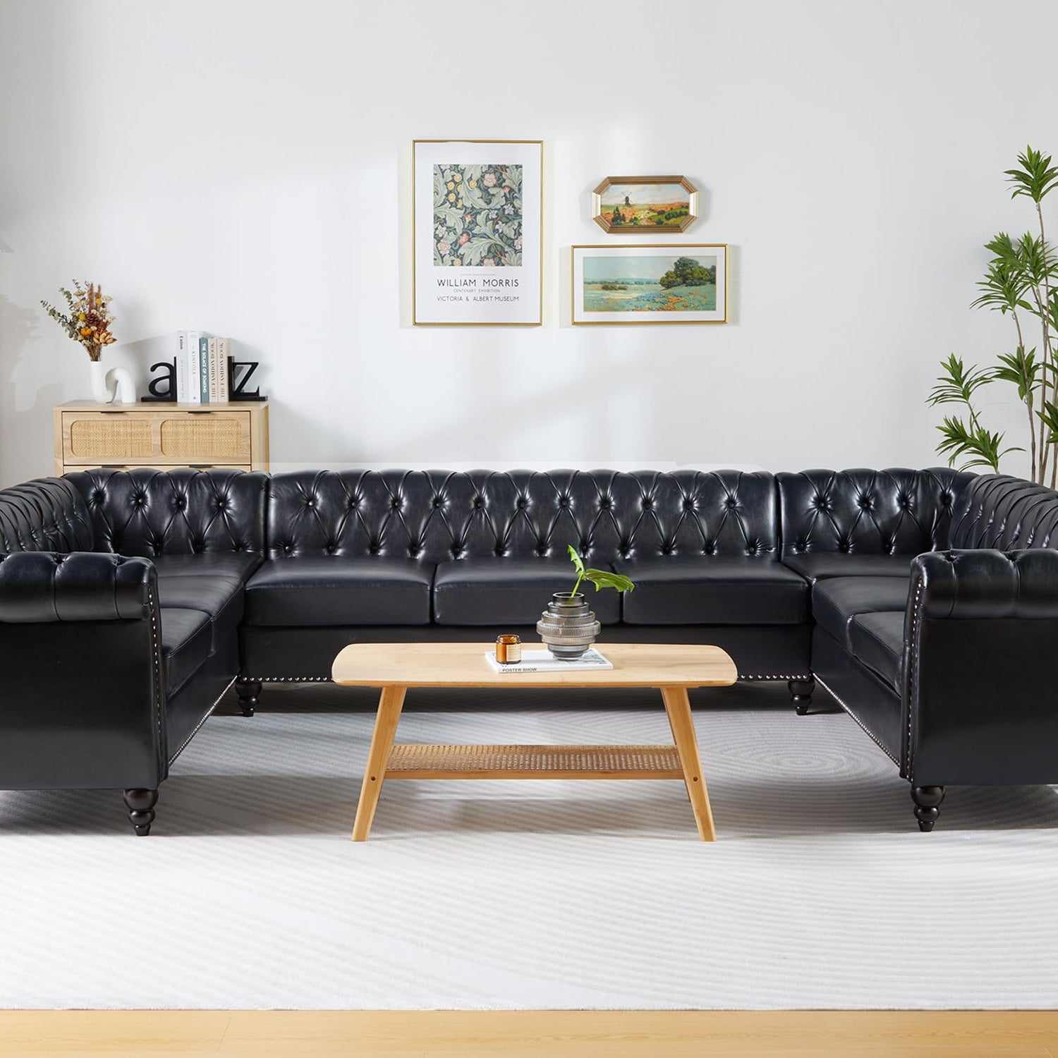 U Shaped Large Sectional Sofa, Chesterfield Leather Faux Couch Tufted Accent Sofa with Scroll Arms and Nailhead for Living Room, Office