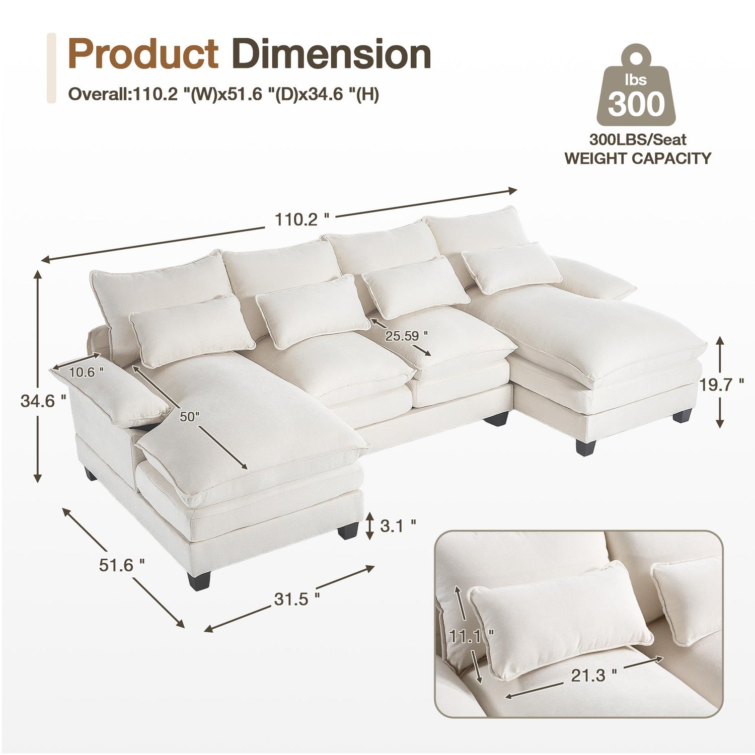 UPHYB 110.2" U Shaped Cloud Couch, Comfy Sectional Sofa Couches for Living Room, Modern Chenille 4 Seat Upholstery Couch with Double Chaise and Double Layer Cushions